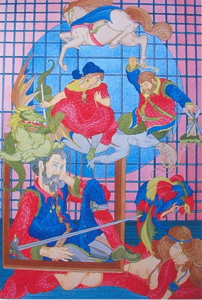 Palladini da un cielo scuro fa partire un fascio di luce in cui imprigiona la coppia Don Chisciotte - Sancho che cavalcano, perdendosi nel bosco, nella macchia della campagna iberica dai colori sabbia e ocra, verso un’aurora rosata. Senza discontinuità, con una tensione palpabile da Dulcinea a Sancho, passando per Don Chisciotte a cavallo, in uno scintillio di oro, rosso, nero, giallo, e marrone: c’è tutto il mondo di Cervantes proteso in uno slancio nella preziosa tavoletta di Caminati. I colori accendono i dipinti, ma in Canosa diventano scene gioiose su piani diversi, quasi un circo, un quadro dentro il quadro, una vetrata, un'esplosione di colori, di figure in movimento: Don Chisciotte in cornice è circondato dai suoi incubi e dai suoi desideri, solo il cavallo galoppa con una ampia, armoniosa falcata. Ma il fantastico cavaliere è sempre solo, sia che domini la scena, sia che sia posto in un angolo: in Job è triste e abbandonato, libero dall'armatura, ma solo, non è più il cavaliere folle del '600, è un uomo contemporaneo, è uno di noi che guarda nel vuoto, stanco, perfino i colori degli abiti dimessi, vinaccia e marrone, dicono la fine del sogno, la caduta delle illusioni. Anche Di Giusto disegna con colori smorti e linee appena abbozzate l'interiorità di questo uomo perso nella sua solitudine, seguito da un Sancho fedele ma inconsapevole, per questo ancora più solo. Come il cavaliere di Grande, guidato dalla luna, tutt'uno con Ronzinante, senza meta, essenziale nelle linee e nei colori, ma efficace. Romantico questo Don Chisciotte, ma, se lo guardi in primo piano, folle, come il vecchio di Rigon: dal viso scarno, l'occhio fisso e allargato, le mani ossute, avvolto in un mantello - lenzuolo: non colori ma incisivi tratti di disegno lo rendono stralunato, impaurito. Il nostro è un eroe triste, anche se alcune avventure sono esilaranti; egli combatte la sua battaglia della vita, in essa cerca la sua verità, ma non si rende conto che ciò che egli crede realtà non è che visione onirica, creatura della fantasia, della mente. Ma se questo sogno fosse davvero la realtà? È il sogno, la fantasia sicuramente una grande forza che spinge a vivere.
