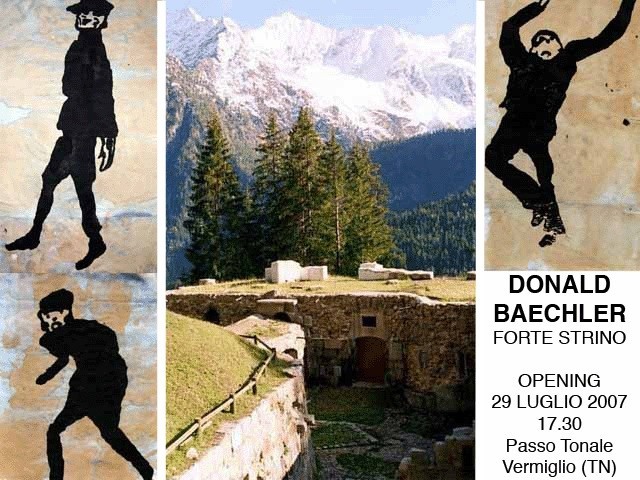 L’americano Donald Baechler contaminerà con le sue gouache l’ambiente carico di storia di Forte Strino a Vermiglio, nei pressi del Passo Tonale in Trentino, che inaugurerà domenica 29 luglio 2007 alle ore 17.30 per concludersi il 3 settembre 2007.