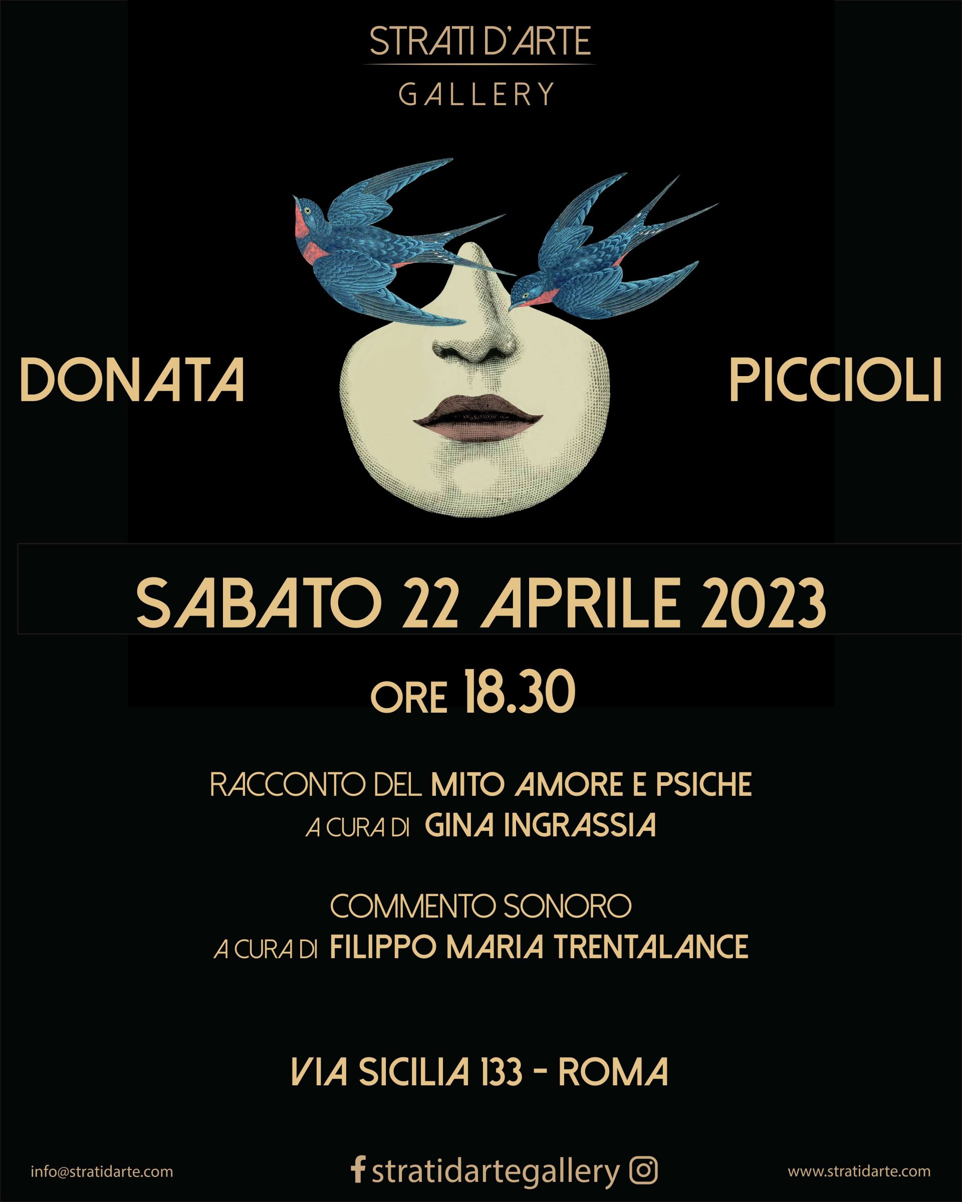 Finissage Mostra Donata Piccioli con il racconto del mito amore e psiche raccontato da Gina Ingrassia e con il commento sonoro di Filippo Maria Trentalance
