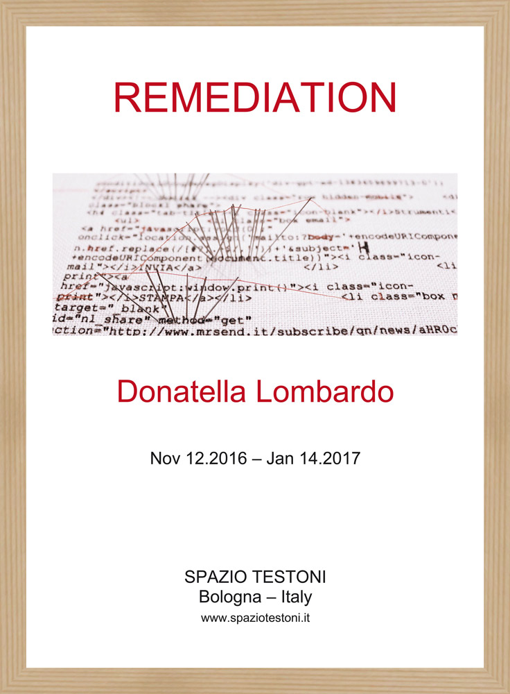 Il titolo della mostra prende in prestito il termine remediation dalla teoria omonima avanzata dagli studiosi Jay David Bolter e Richard Grusin, i quali affermano che il contenuto dei media digitali sono tutti gli altri media, a partire dalle forme più antiche di comunicazione analogica. Una sintesi terminologica alla quale si rifanno le opere che Donatella Lombardo ha appositamente realizzato per questa sua prima personale a Bologna, attraverso le quali interpreta e ci mostra con la sua originale ricerca artistica le strutture e le criticità dell'informazione attuale, indagando le tecnologie di comunicazione di massa, e nello specifico, la comunicazione via Internet e la conseguente evoluzione del linguaggio attuale parlato e scritto. Il suo intento è quello di mettere a nudo artisticamente i meccanismi che supportano e rendono fruibile la Rete, proponendo elaborazioni grafiche e narrative tratte dal flusso mediatico dell'informazione odierna. Ed è proprio dall’interno di questo flusso mediatico, a volte recondito e a volte abbandonato su vari supporti informatici, che Donatella Lombardo trae i frammenti dei testi che ci mostra imbrigliati su di una tela, come tracce di quell'oralità e di quella scrittura che per molto tempo hanno occupato spazi fisici diversi per esprimere il pensiero ed il vissuto popolare ed elitario, e che oggi sono costituiti da una mescolanza di forme eterogenee di comunicazione, dove parola, suono e immagine si fondono, coesistendo all'unisono come un'unica entità pronta a plasmare la nostra identità rimediata.