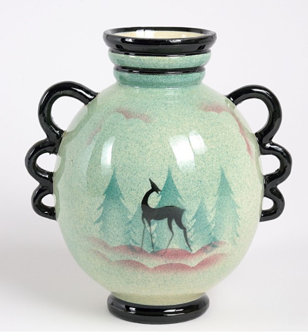 Immagine: Mica (Sesto Fiorentino, 1930-39) – Vaso biansato aerografato su fondo verde con alberi e gazzella, H 22 cm., Φ 16 cm. Marchio Mica/Sesto Fiorentino.