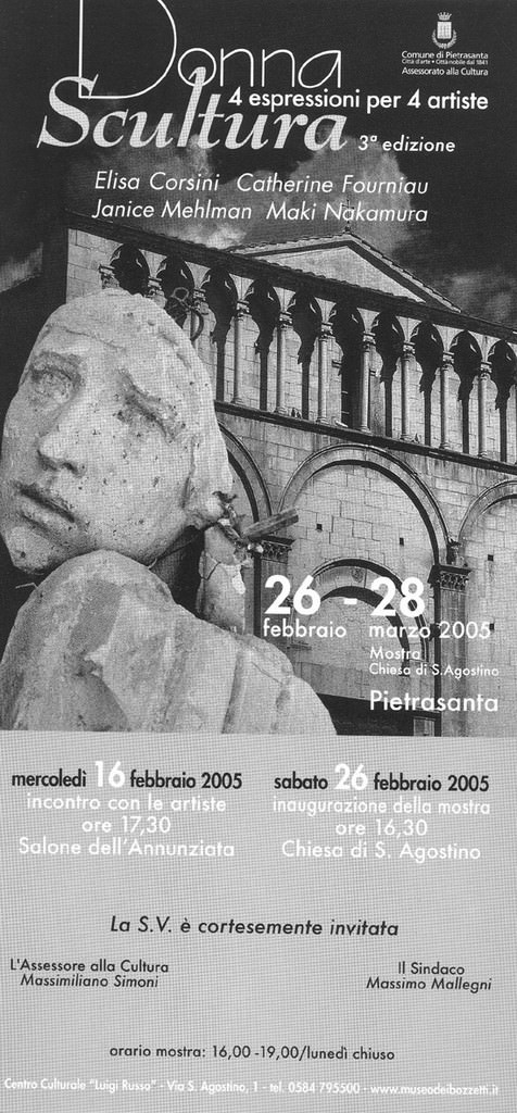 A proposito di DonnaScultura, così si esprime Massimiliano Simoni: “ Il 2005 è anche il terzo anno di DonnaScultura, che celebra nella Chiesa di Sant’Agostino il ‘canto’ di quattro artiste, votate all’arte, ma soprattutto alla scultura. Di quattro nazionalità diverse, hanno contribuito e contribuiscono ad arricchire l’entourage culturale di Pietrasanta, il fervore intellettuale e manuale sia nei laboratori artigiani che magari nei caffè in piazza. Elisa Corsini, Catherine Fourniau, Janice Mehlman, Maki Nakamura sono presenti in quest’area da molti anni, costituendone parte del sostrato artistico, roccia fondamentale ed esempio per gli artisti a venire. DonnaScultura anche quest’anno si è rivelata una vivace ‘sorpresa’ grazie alla costante e valida collaborazione delle artiste –che qui ringrazio sentitamente– le quali, aprendosi e rivelandosi attraverso la loro arte, ci hanno permesso di intravedere all’interno delle loro esperienze artistiche personali. Non è facile mettere insieme quattro artiste di chiara fama e far sì che presentino le loro opere, e quindi le loro storie, in armonia tra di loro. La Chiesa di Sant’Agostino, forse nella sua peculiarità, storicamente ha la caratteristica di offrire un ambiente consono a questi incontri cosmopoliti, conciliandone la presentazione. Quattro voci di artiste, ma specialmente di donne, quattro interpretazioni di una sensibilità più fine, ognuna distinta da una personalità spiccata, eppure simile, per intonazione: più alta, più profonda, più penetrante, più duratura.”
