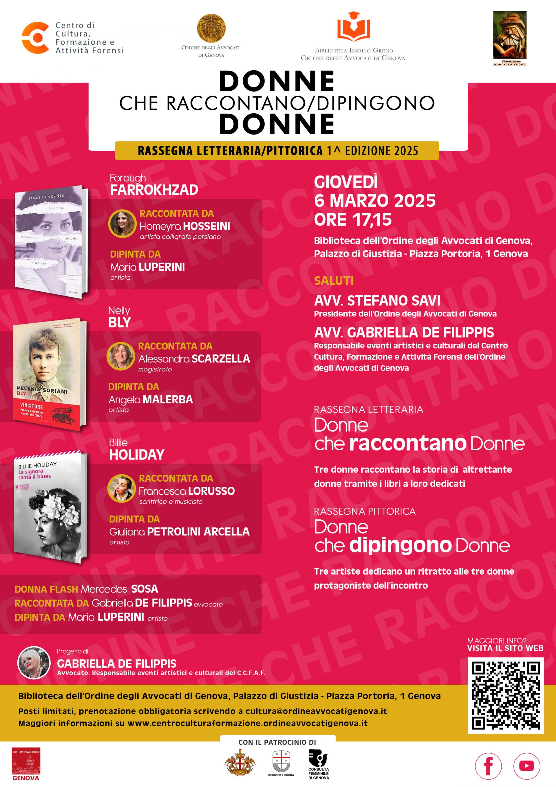 Per quanto riguarda più specificatamente l’incontro di questo prossimo 6 marzo, che, come si è detto, si terrà nei locali della Biblioteca E. Grego , sita all’interno dell’Ordine degli Avvocati di Genova, a sua volta ubicata dentro Palazzo di Giustizia, in Piazza Portoria 1, alle ore 17,15 le tre professioniste che presenteranno la biografia delle donne famose scelte per questa occasione saranno Homeyra Hosseini, artista calligrafa persiana, , che parlerà di Forough Farrokhzad, una delle potesse più note e rappresentative dello stato iraniano, Alessandra Scarzella, magistrato , che parlerà di Nelly Bly , giornalista statunitense, tra le prima a dedicarsi al giornalismo investigativo e creatrice del genere “giornalismo sotto copertura” e infine Francesca Lorusso, musicista e scrittrice, che ci parlerà di Billie Holiday, una tra le più grandi cantanti statunitensi nei generi jazz e blues.