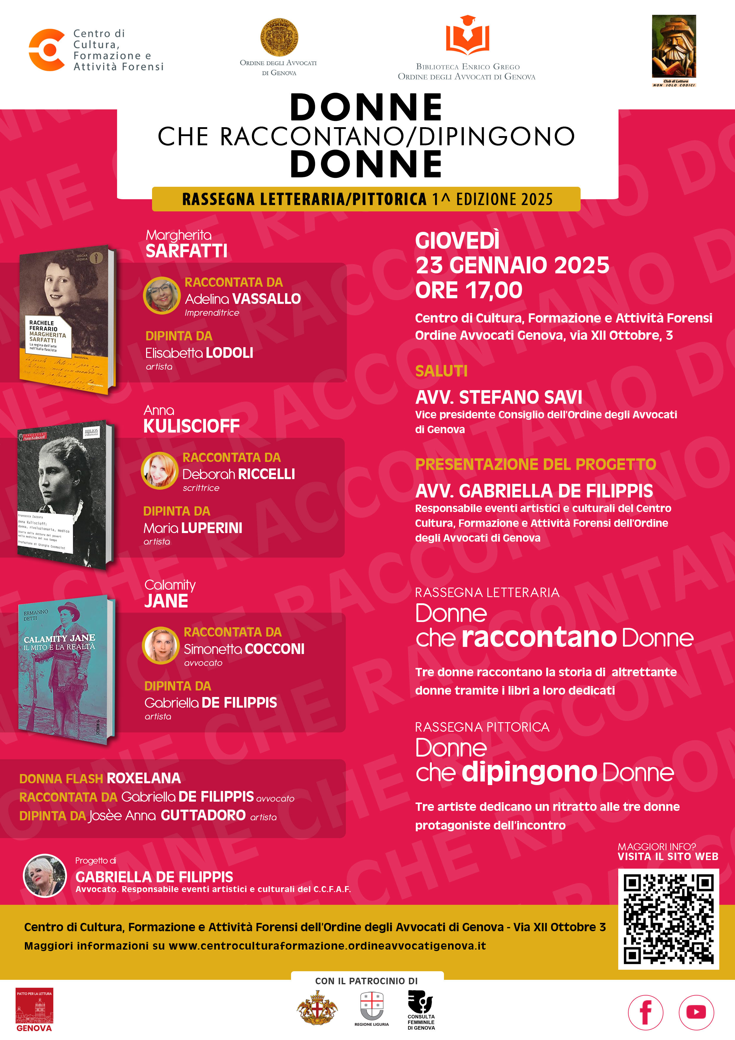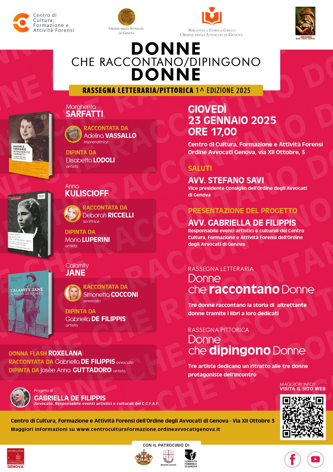 A partire dal mese di gennaio 2025 il Centro Cultura dell’Ordine degli Avvocati di Genova darà il via ad una serie di incontri culturali/artistici con una nuova rassegna letteraria/pittorica dal titolo DONNE CHE RACCONTANO/DIPINGONO DONNE.
