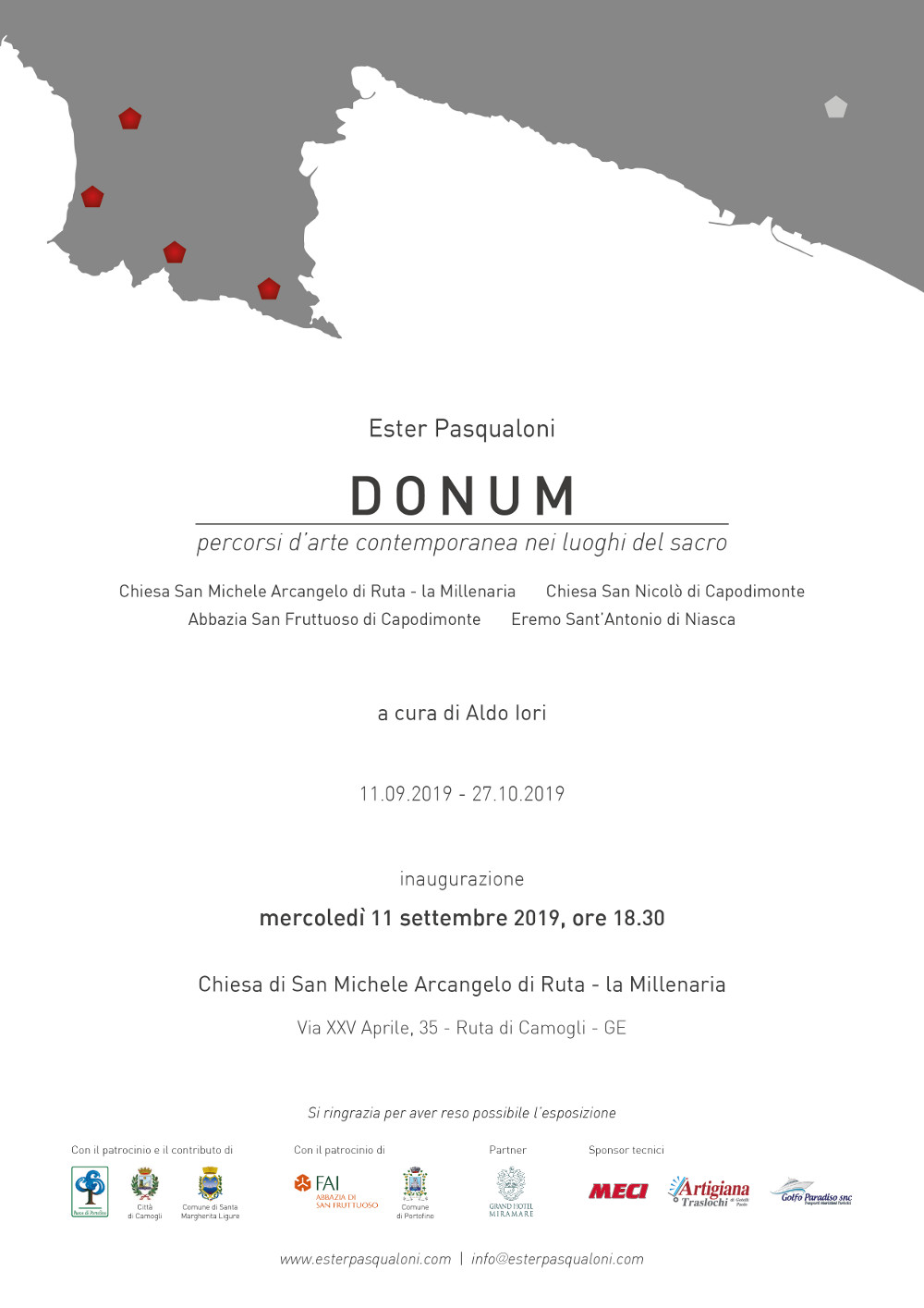 Mercoledì 11 settembre 2019 alle ore 18.30 nella Chiesa di San Michele Arcangelo di Ruta - la Millenaria si inaugura l’esposizione DONUM percorsi d’arte contemporanea nei luoghi del sacro dell’artista Ester Pasqualoni a cura di Aldo Iori.