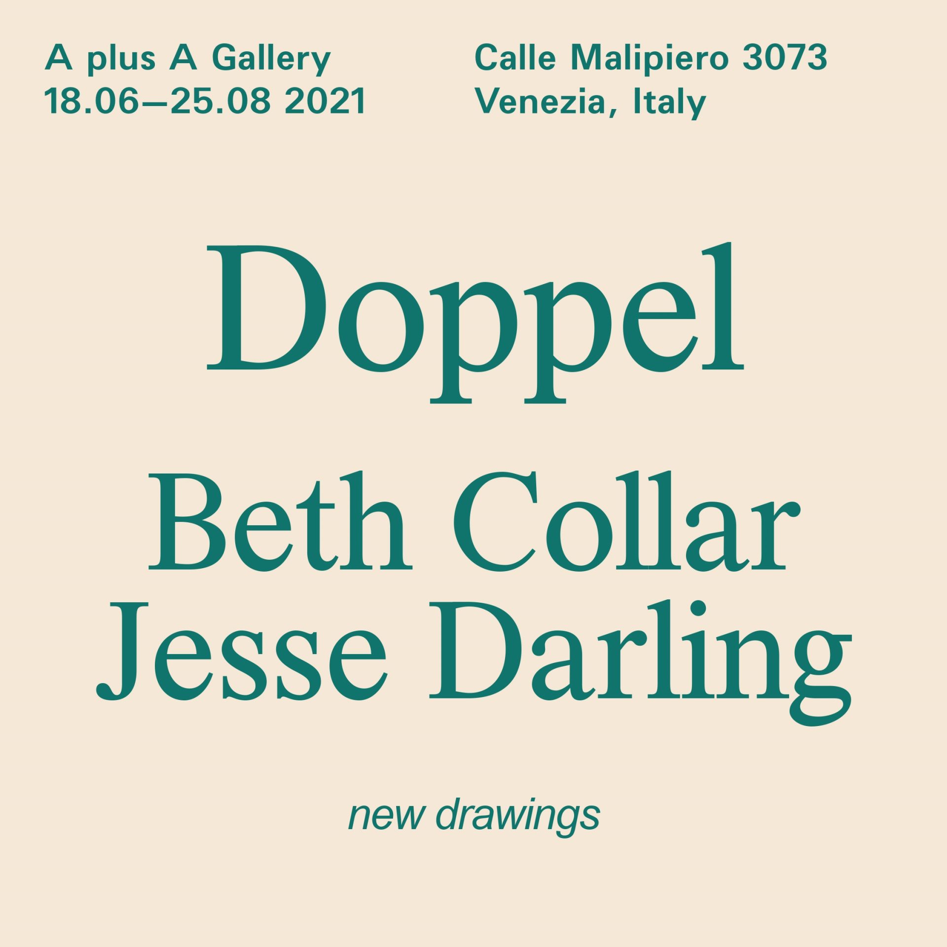 La galleria A plus A ha il piacere di presentare Doppel, una mostra di Beth Collar e Jesse Darling. Collar e Darling inglesi, di base a Berlino, per questa occasione hanno realizzato una serie di nuovi disegni in cui affrontano la finitezza della realtà biologica e la fragilità del corpo umano. Al contempo però, sollevano delle questioni da sempre legate alle relazioni e al linguaggio.