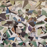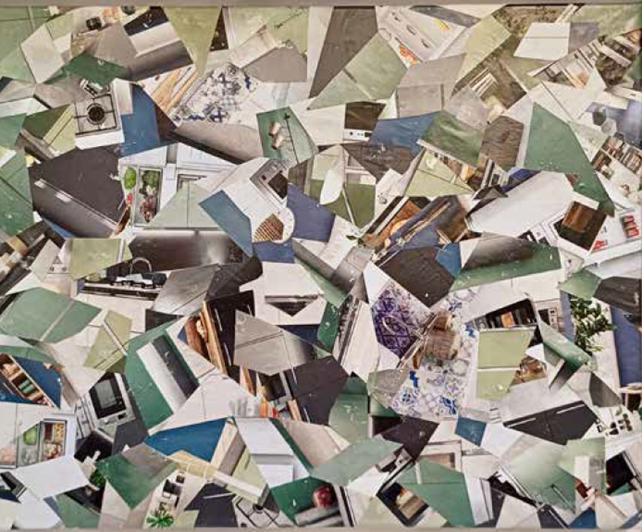 Filippo Soddu, dal canto suo, esplora il linguaggio del collage con una passione viscerale per il colore e la materia. Le sue opere, intense e stratificate, sono composte con carta spessa, ruvida, dipinta e poi strappata con gesti che sembrano richiamare il movimento della memoria e del tempo. Le immagini di riviste, fotografie e frammenti poligonali si uniscono in un gioco caleidoscopico che cattura lo sguardo e lo confonde in una dinamica instabile, mai conclusa. Qui, il colore non è solo superficie, ma diviene un suono che riverbera, creando un ritmo ipnotico che trascina chi osserva in un continuo movimento, come se ogni frammento raccontasse la storia di un’unità originaria che si rivela attraverso la frammentazione.