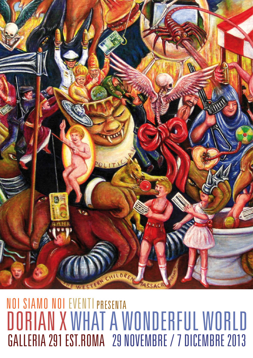 Già il titolo della mostra richiama la canzone resa famosa da Louis Armstrong, e manifesta chiaramente la forte ironia che pervade le opere esposte. Un’ironia amara, a tratti ferocemente critica verso la rappresentazione di una società che si sforza in tutti i modi di apparire perfetta e gioiosa,invece nasconde una realtà miserevole e spietata. Dorian X è un artista che cura il significato dell’opera più della superficie dipinta, impegnato a dipingere ciò che effettivamente non si nota o si preferisce non vedere. Forse è anche questo il motivo per cui in questa serie di opere appaiono di frequente i supereroi più popolari dell’immaginario occidentale, Batman e Superman.