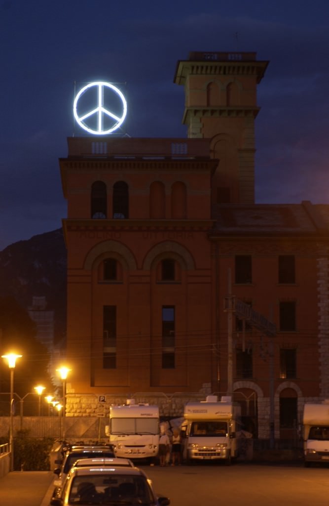 Le serate si svolgeranno nell’enorme capannone dell’ex Italcementi, sotto la luce glaciale del grande neon dell’artista kosovaro Sislej Xhafa, Double Happiness, che alterna due simboli universalmente conosciuti e dai significati diversi, il logo della pace e quello della Mercedes, contrapponendo, e allo stesso tempo rendendo provocatoriamente intercambiabili, gli opposti desideri e i sogni della nostra società attuale.