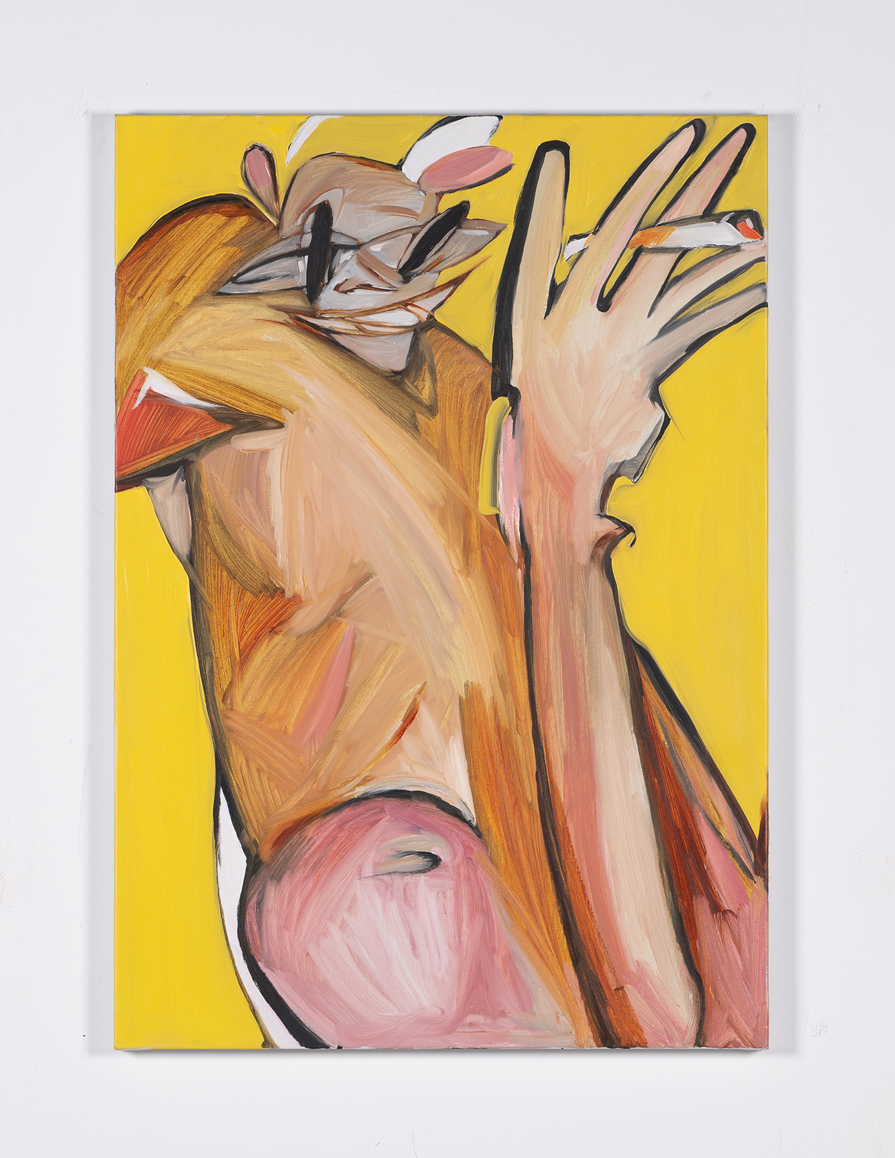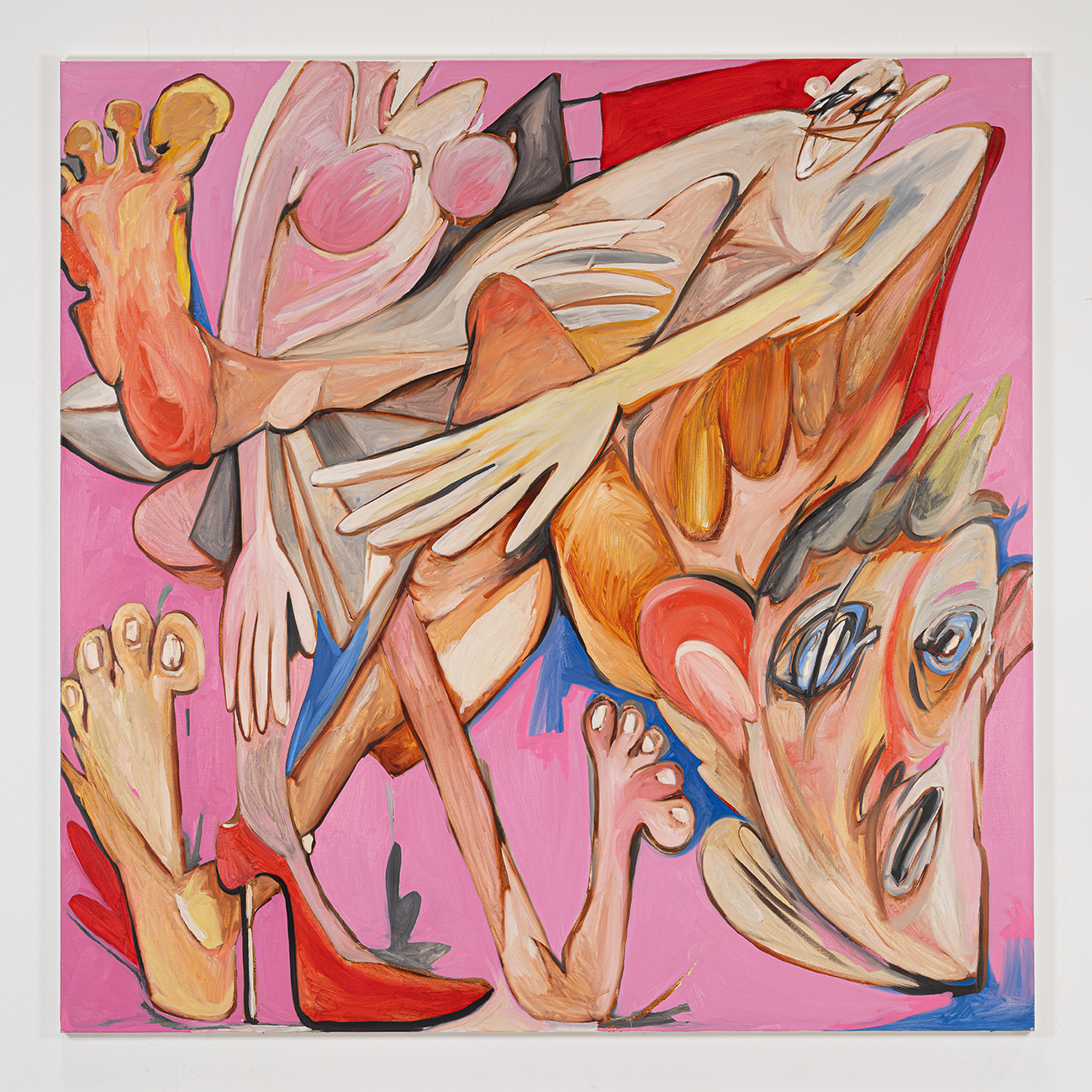 La mostra propone una serie di tele di grandi dimensioni in cui le regole dell’anatomia e della fisica vengono meno. Le opere si affollano di occhi sporgenti, gambe contorte, piedi allargati e parti del corpo fluttuanti. Anche se in apparenza umoristiche e vibranti, hanno un sottofondo di ambiguità e minaccia. Come spettatori siamo attratti da tali figure, dai loro corpi grotteschi, insieme affascinanti e ripugnanti. Scorrono, si smontano e si ricompongono sfidando l’ordine logico e trasgredendo ogni canone estetico.