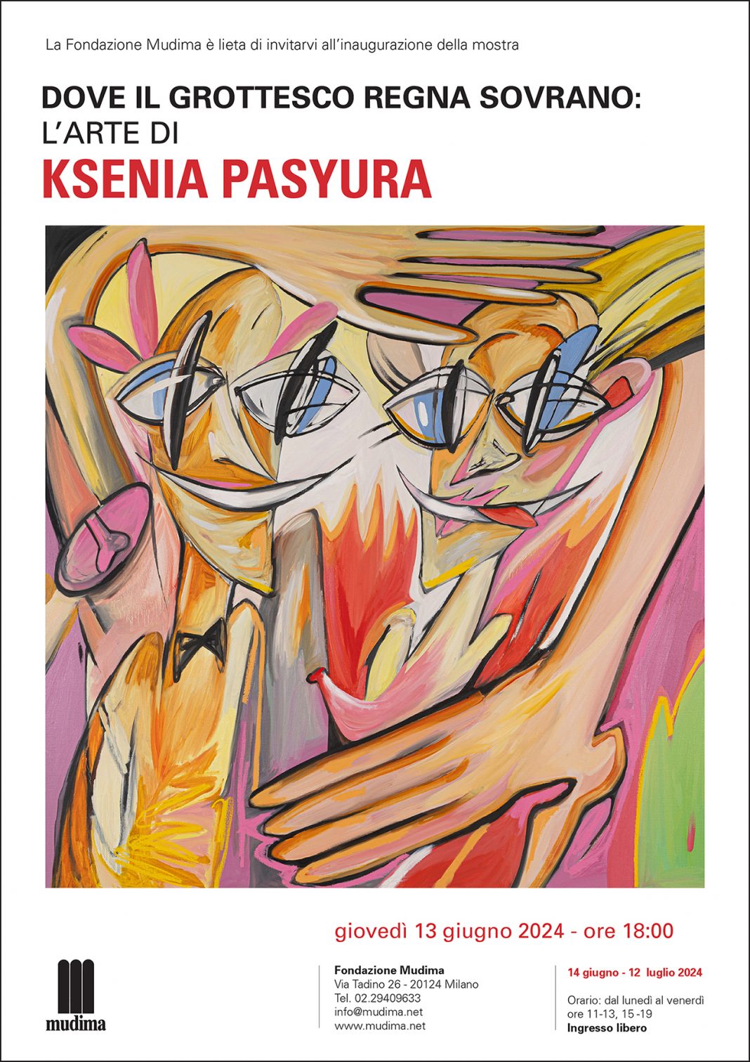 Con una mostra che offre un’immersione nel grottesco e nel sublime, la Fondazione Mudima presenta la prima personale a Milano dell’artista londinese Ksenia Pasyura. Dal 14 giugno al 12 luglio 2024 circa trenta dipinti, tutti inediti, promettono un’esperienza che sfida le percezioni ed evoca profonde riflessioni sulla condizione umana. Il lavoro di Pasyura, caratterizzato da elementi surreali, esplora infatti i temi dell’identità, della trasformazione e dei confini della realtà.