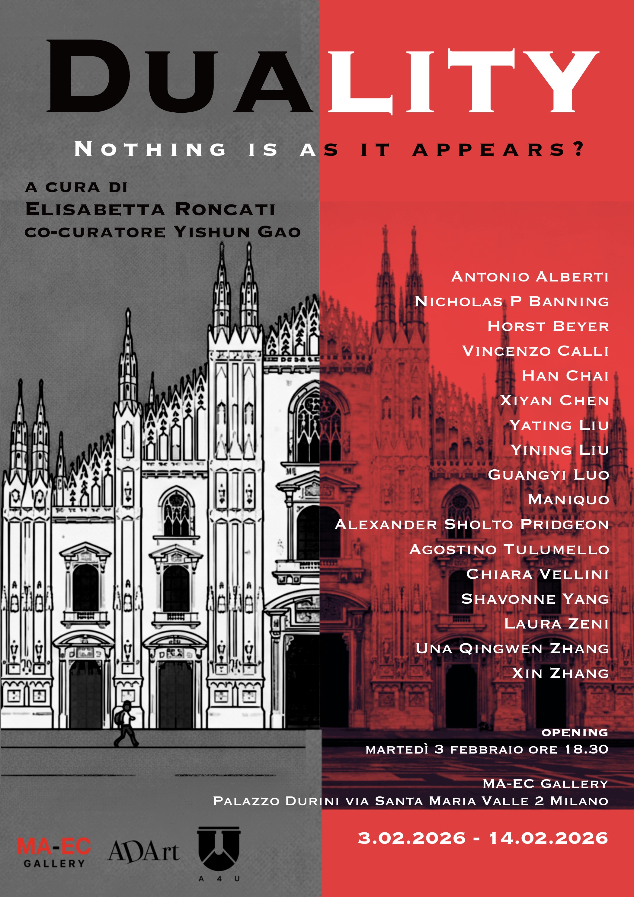 Martedì 3 febbraio verrà inaugurata, presso la MA-EC Gallery, la seconda edizione di Duality. Nothing is as it appears?, mostra collettiva a cura di Elisabetta Roncati e Yishun Gao. L’esposizione è in collaborazione con A4U e ADArt.