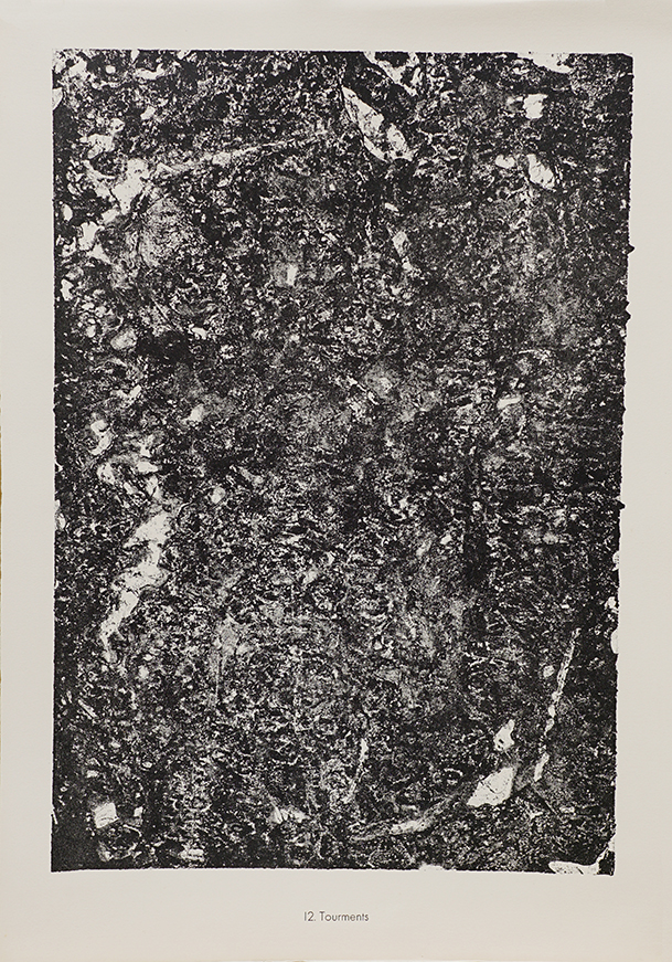 Verso la fine degli anni Cinquanta, quando comincia l’avventura dei Phénomènes, Dubuffet ha già alle spalle un consistente lavoro sulla materia. La sua ricerca si impegna in un’analisi attenta – artistica, filosofica, estetica e simbolica – sul tema della natura, partendo da una celebrazione del suolo e della terra. Difficile parlare di proporzione e simmetria quando si assembla del fango o un pezzo di muro sbrecciato; il carbone, il gas, i muschi e i licheni, per citare solo alcuni tra i tanti materiali utilizzati, diventano il soggetto di un’esplorazione incessante dove la sorpresa è continua e l’investigazione quasi scientifica. Si tratta di impronte prese da materiali diversi su carta da riporto inchiostrata. Maroncelli 12 presenta le 18 tavole (l’intera cartella) di Sols, Terres, nell’esemplare contrassegnato C (e firmato dall’autore) stampato per Giuseppe Raimondi. Nono degli album in bianco e nero della serie Phénomènes, questa opera è stata tirata in 22 esemplari numerati più tre esemplari contrassegnati A, B, C, tutti su pergamena.