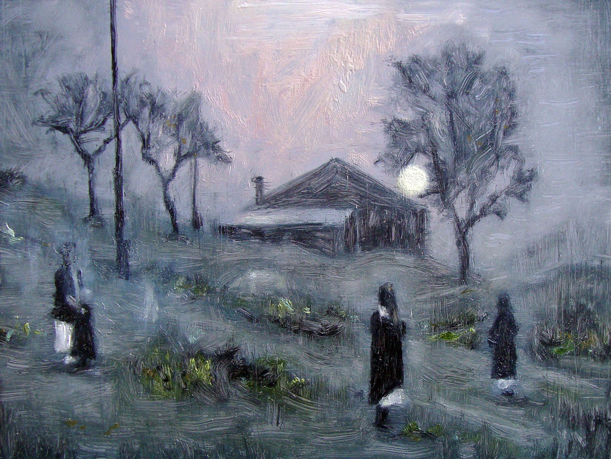La mostra "Due passi indietro" presentata alla Blu Gallery di Bologna, comprende opere recenti di Christos Giannopoulos che appartengono a due tematiche e hanno come principale mezzo espressivo la pittura ad olio su tela. Queste opere si basano su un archivio personale dell'artista, composto da fotografie da lui scattate, nonché da sequenze di film e polaroid selezionate del regista Andrej Tarkovskij. In entrambi i casi, il modo in cui viene reso, ad esempio, un paesaggio, non è tanto una questione di rappresentazione realistica, quanto di un possibile ricordo di un luogo piuttosto vago e sfumato. Qualcosa di simile accade quando ricordiamo eventi passati e li percepiamo nel presente in modo diverso da quello che abbiamo vissuto allora.