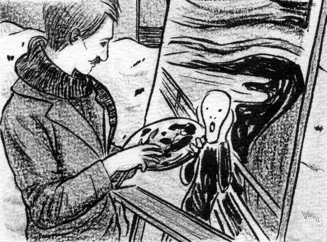 Siamo nel 1893 quando Edvard Munch termina il dipinto chiamato “L’Urlo”, il primo di una serie di 4 opere nelle quali, il pittore norvegese getta le basi per un lavoro seriale su questo tema che include anche lavori grafici con lo stesso soggetto. Riguardo alle genesi dell’opera, si narra che Munch stesse camminando con due amici in un parco ma, sentendosi affaticato, si appoggiò ad una balaustra dalla quale, davanti a se, poteva vedere il fiordo e dietro di lui gli amici che stavano proseguendo la camminata. Intorno a lui, il cielo del tramonto si fece con i colori quasi di fuoco, talmente forti da provocare in lui uno shock. Da qui scaturì quell’urlo interiore che Munch fu quasi costretto a dipingere una volta tornato a casa. Ci volle molto tempo perché il primo Urlo prendesse la forma che lui aveva in mente: un’immagine forte che ritraeva quella scena vissuta nella quale si sentì sopraffatto dalla vita e dalla potenza della natura. Non solo il più importante quadro espressionista nordico ma anche uno straordinario elemento pop che infatti Munch ripeterà più volte, in netto anticipo sulla pop art americana.