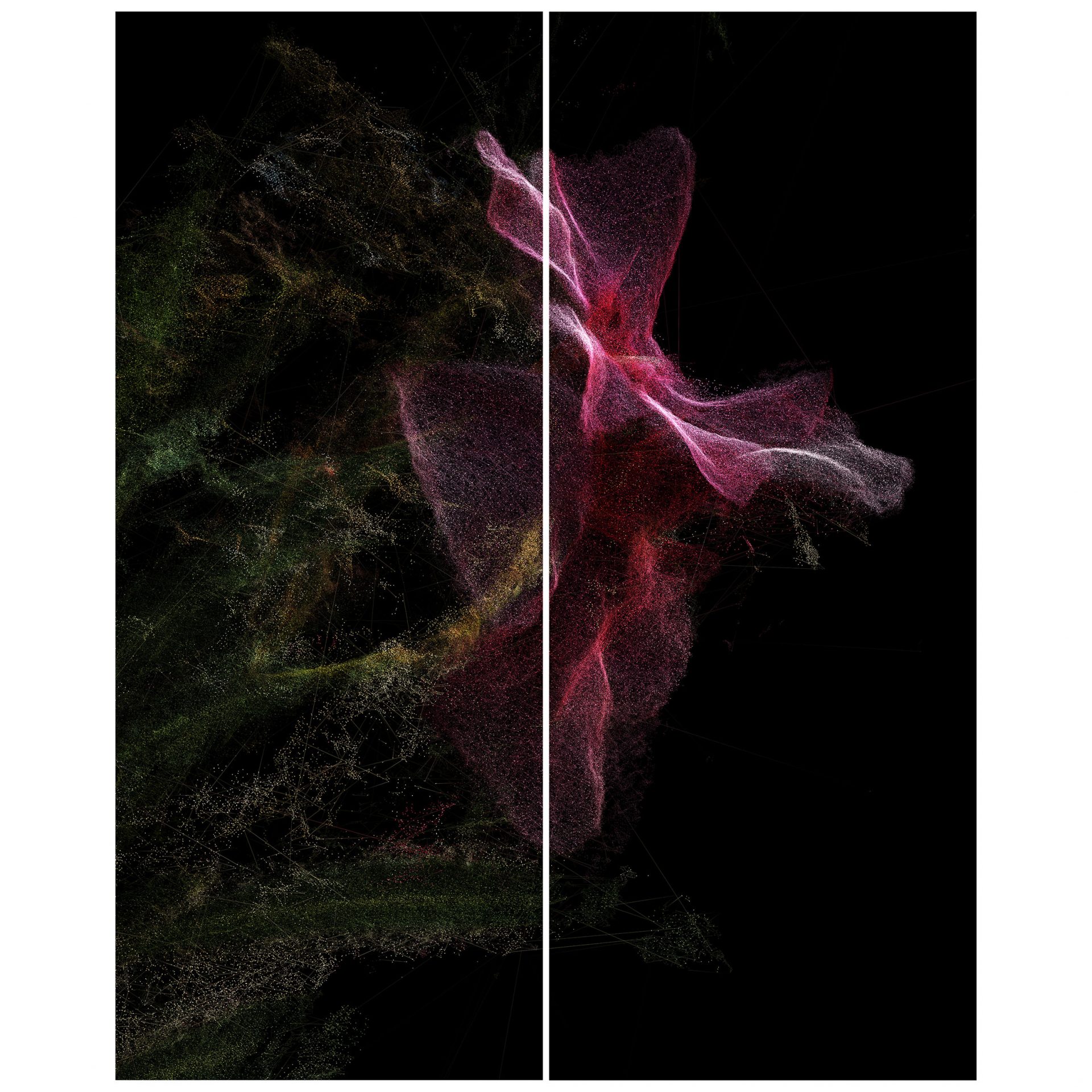 Pittura , scansione botanica, installazione, impiego di parti elettroniche, ready made reinterpretato, esplorano la dimensione dal buio verso una ritrovata via d’uscita.