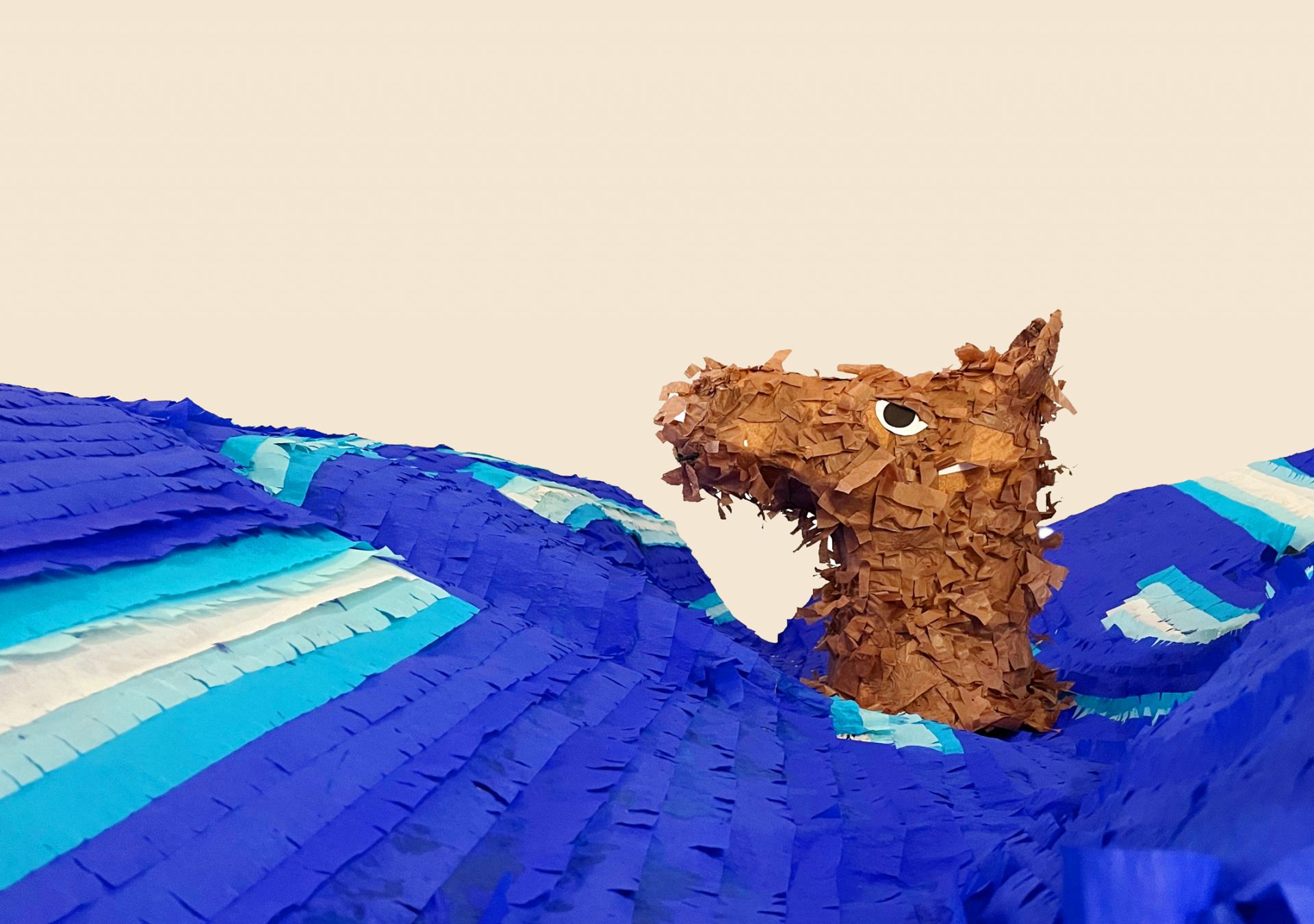 Benavente lavora con la forma della piñata dall’inizio della sua carriera, attratto dalla sua peculiare unione di festa e violenza — l’atto ritualizzato del colpire, rompere ed esporre un nucleo fragile. In questa installazione, tale logica si espande dall’oggetto all’ambiente. La zattera mette in scena non un trionfo né un disastro, ma il momento sospeso tra i due: non La zattera della Medusa come viene solitamente evocata — eroica, allegorica, monumentale — ma una sorta di intervallo post-naufragio o pre-salvataggio, in cui il corpo è intrappolato tra disfatta e redenzione. Le figure stremate di Géricault sono sostituite da personaggi luminosi, assurdi, fatti a mano, la cui vulnerabilità non è meno reale per il fatto di essere fatti di carta e colla.