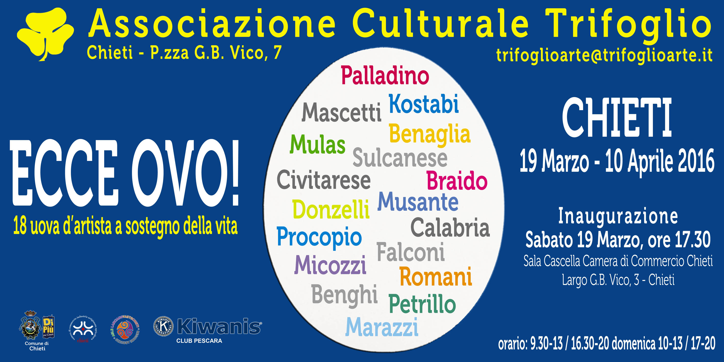 La mostra “Ecce Ovo!” sarà inaugurata sabato 19 marzo alle ore 17.00 e preceduta da una presentazione critica a cura della Dott.ssa Maria Cristina Ricciardi presso la Sala Cascella della Camera di Commercio di Chieti, alla presenza del Presidente del Club Kiwanis di Pescara Dott.ssa Emilia De Matteo, del Sindaco di Chieti Avv. Umberto Di Primio, del Direttore della Clinica Pediatrica Dipartimento Materno-Infantile Prof. Francesco Chiarelli e del Presidente dell’Associazione Trifoglio Dott. Alessandro Conti.