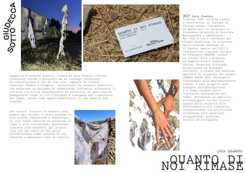 Luca Granato (Cosenza, 1999), si diploma in Pittura all’Accademia di Belle Arti di Catanzaro, dove frequenta la scuola di Scultura Monumentale e Ambientale. Attraverso un approccio antropologico, la sua ricerca spazia dalla scultura alla performance, fino alla videoarte, concentrandosi su questioni etnografiche, storiche, sociali ed ecologiche. Nel 2023 è vincitore del concorso europeo di videoarte SEARTH e riceve una menzione speciale del COMBAT PRIZE. Di recente vince la open call di Booming Art Fair di Bologna con il progetto ‘Lenti nel sogno’, dove in occasione del primo anniversario della strage di Cutro (CR), ripropone un’installazione del video ‘Hoeing the sea / Zappava lu mari’, estratto da una performance svoltasi sulle rive della costa tirrenica nell’agosto 2022.
