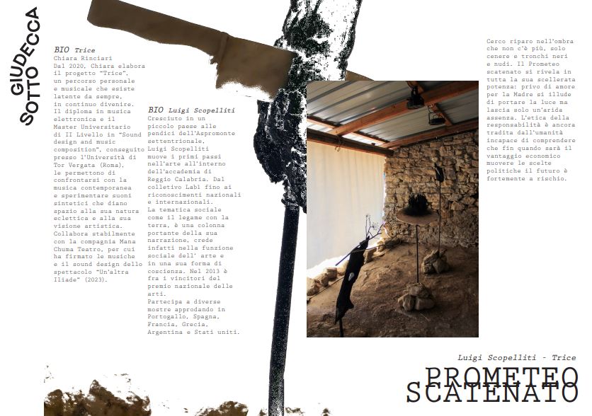 La riflessione sulla catastrofe ambientale causata dai poderosi incendi che anche quest’estate hanno impunemente afflitto la Calabria, è al centro dell’installazione ‘Prometeo Scatenato’ di Luigi Scopelliti e TRICE, composta da un gruppo di sculture polimateriche in legno, marmo, pietra, rami, che entrano in relazione con una traccia audio potente ed evocativa. Qui l’uomo si rivela in tutta la sua scellerata potenza e l’etica della responsabilità è tradita ancora una volta da una società cieca e inaridita: “cerco riparo nell’ombra che non c’è più, solo cenere e tronchi neri e nudi”.