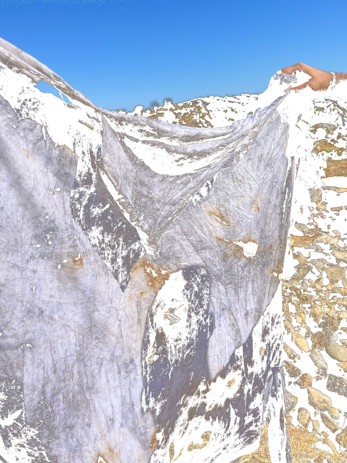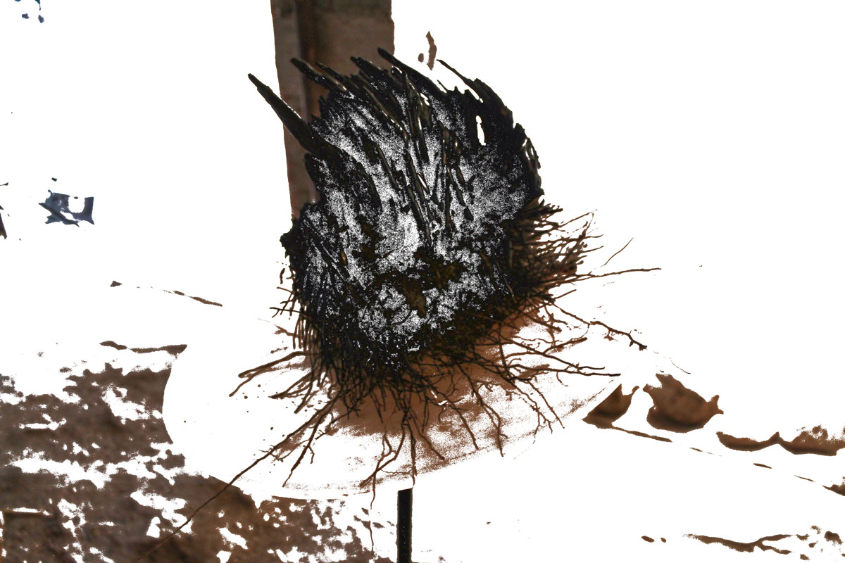 Gli effetti simbolici di questa devastazione sono parte del ciclo ‘Quanto di noi rimase’ di Luca Granato, in cui tessuti d’uso domestico, come corredi di lenzuola, federe e tovaglie, propri di un quotidiano intimo e familiare, subiscono un processo di combustione indiretta, attraverso il contatto con scorie incandescenti di saldatura. Questi stracci bruciati, issati su tralicci metallici come bandiere consunte e lacerate dal tempo, diventano sudari del ricordo, ostensioni di una ritualità arcaica in cui riaffiora una poetica dell’attraversamento (vita/morte) universalmente condivisa.