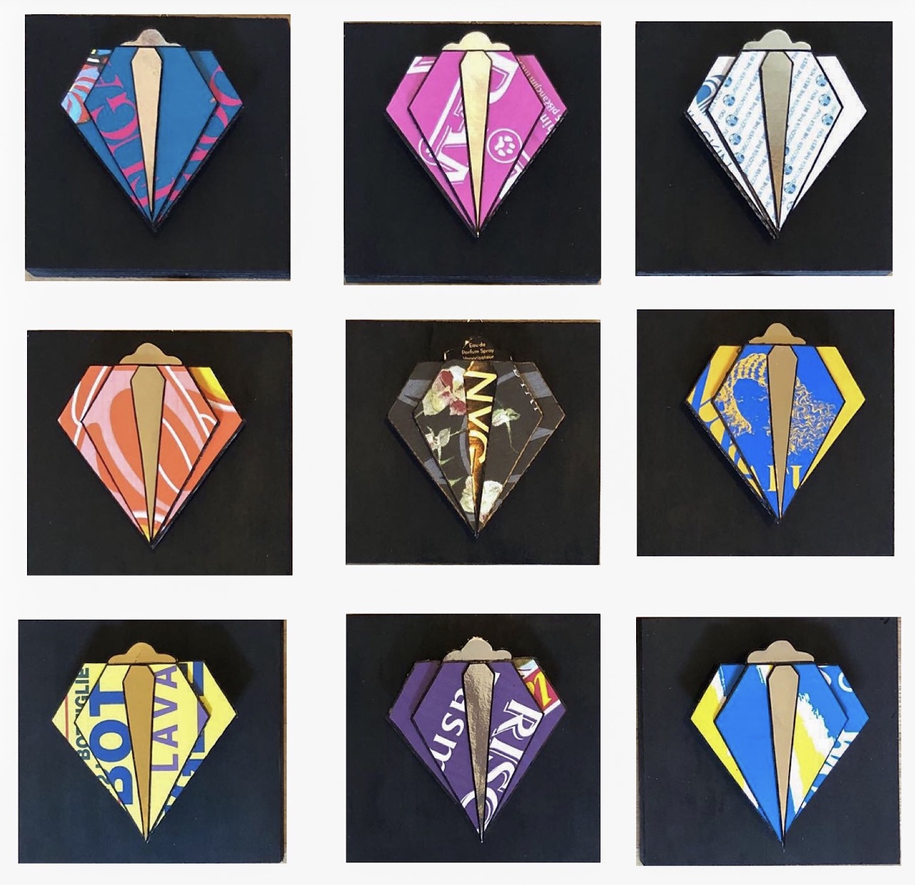 Carla Marletta attraverso un insolito upcycling di cartoni da imballaggio compone mosaici di colori e testo scritto