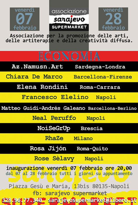 Economia, terza collettiva nell'home-studio napoletano di Sarajevo Supermarket, è nata per sperimentare nuove modalità di coinvolgimento degli artisti e di selezione delle opere, per contaminare tra loro visioni diverse, per allargare il nucleo degli artisti, degli operatori e del pubblico che contribuisce al progetto.