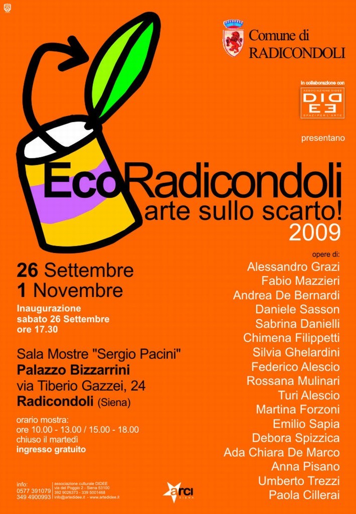 EcoRadicondoli raccoglierà numerose opere, diverse tra loro per materiali ed intenti:unico denominatore comune è l’utilizzo di materiali da recupero. L’evento non si concede immediatamente al visitatore, ma esige di essere cercato:non si fornisce un oggetto da osservare ma una situazione da esperire. Un’opera che ostenta materiali di recupero impone allo spettatore una riflessione sulle ragioni profonde di tale scelta. L’arte sopravvive, cambiando, sperimentando, adattandosi all’oggi, senza perdere la sua funzione comunicativa. Da qui il messaggio che “niente si butta, tutto si trasforma”.
