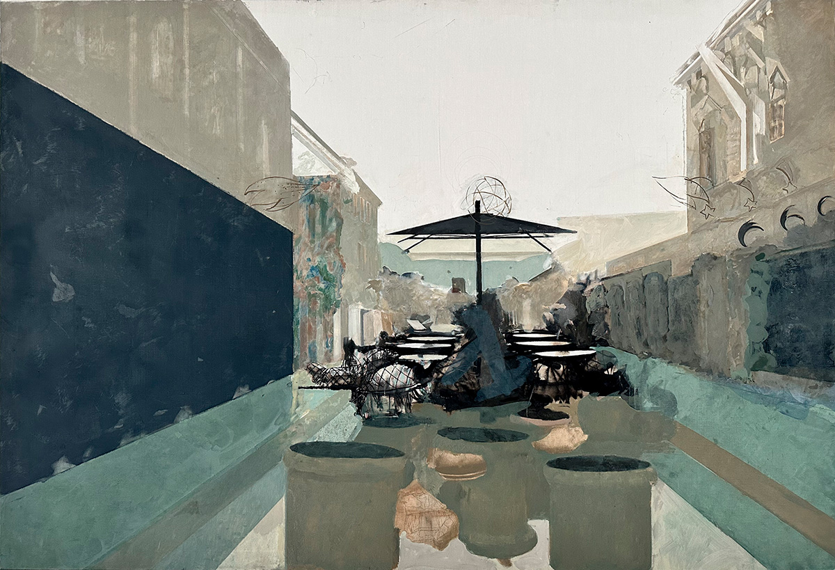 I titoli dei dipinti – tutti realizzati nel 2023 – lo dicono in modo molto chiaro: "In mezzo alla strada", "Nel cortile abbandonato", "Riparo provvisorio", "Circo rotto", "Commercio sul boulevard". Sono luoghi che nel loro anonimato sanno ospitare chiunque, senza distinzioni o negazioni. Eppure qui appaiono svuotati e silenti. La figura umana c’è solo in tre opere, due delle quali si intitolano Limbo e una Ritratto durante la pandemia. Tutti e tre sono ambientati nelle metropolitane, sotto terra, in un luogo distaccato dal cielo, che per antonomasia è legato ai concetti di transitorietà e attesa, mai di stasi e permanenza.