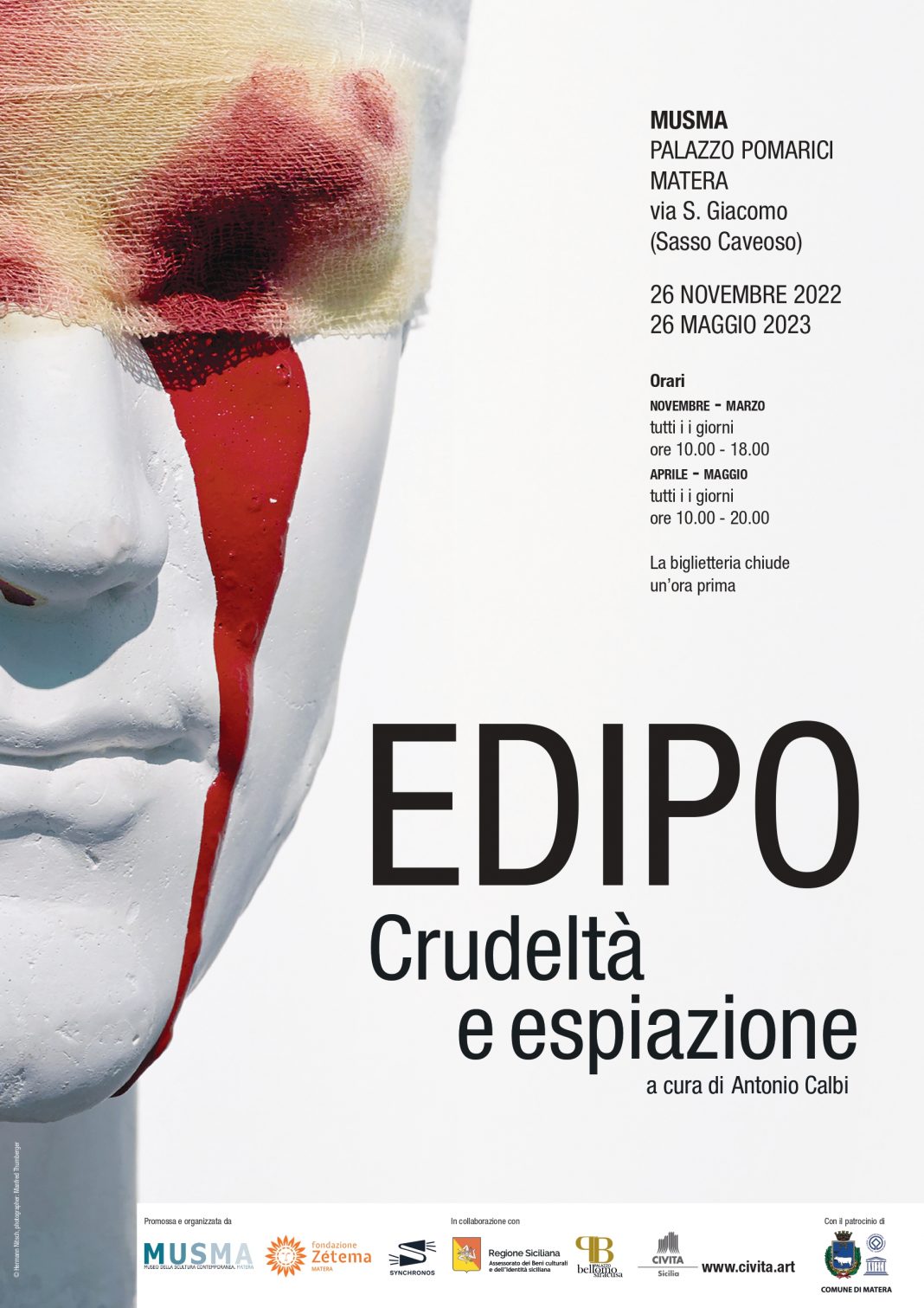 Il 26 novembre, alle ore 18, al MUSMA – Museo della Scultura Contemporanea Matera – in via San Giacomo (Sasso Caveoso), si inaugura la mostra Edipo. Crudeltà e espiazione organizzata dalla Fondazione Zètema di Matera, in collaborazione con Civita Mostre e Galleria Regionale di Palazzo Bellomo di Siracusa. L’esposizione è curata da Antonio Calbi, direttore scientifico della Fondazione Zètema.
