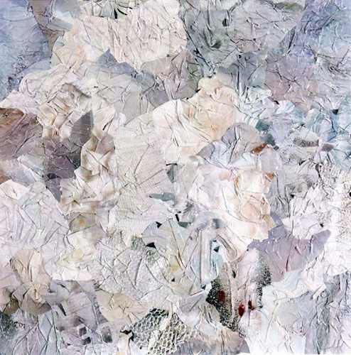 L’artista presenta una scelta di collages degli ultimi anni, costruendo una forma ed un messaggio rivitalizzando un materiale povero,la carta dei giornali, con la tecnica del “papier froissé”, che imprime un andamento mosso e variegato alla luce ed alla superficie.
