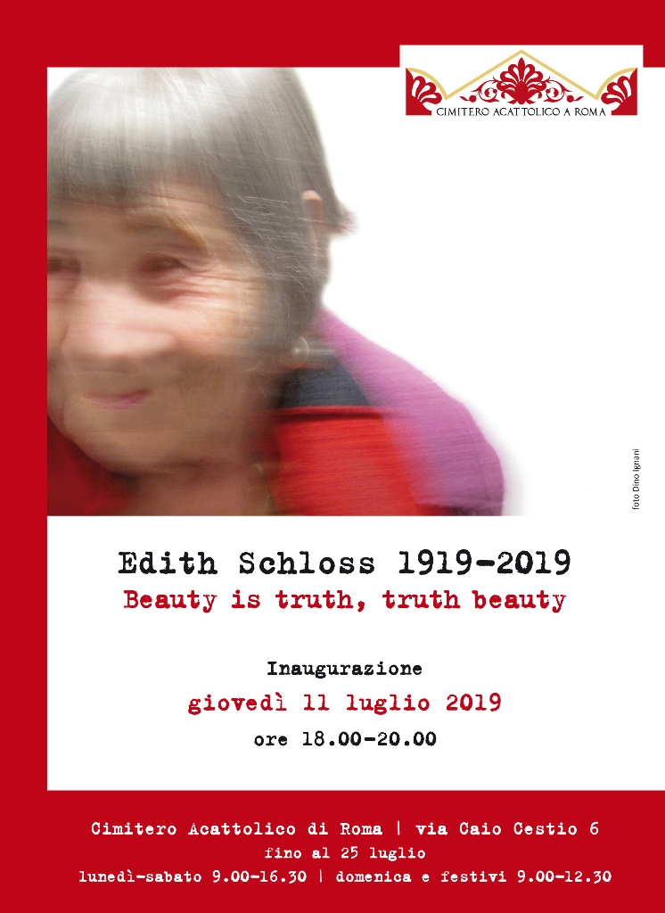 La mostra Edith Schloss 1919-2019. Beauty is truth, truth beauty, che si inaugura giovedì 11 luglio 2019 nella sala espositiva del Cimitero Acattolico di Roma, celebra i cento anni dalla nascita dell’artista americana Edith Schloss.