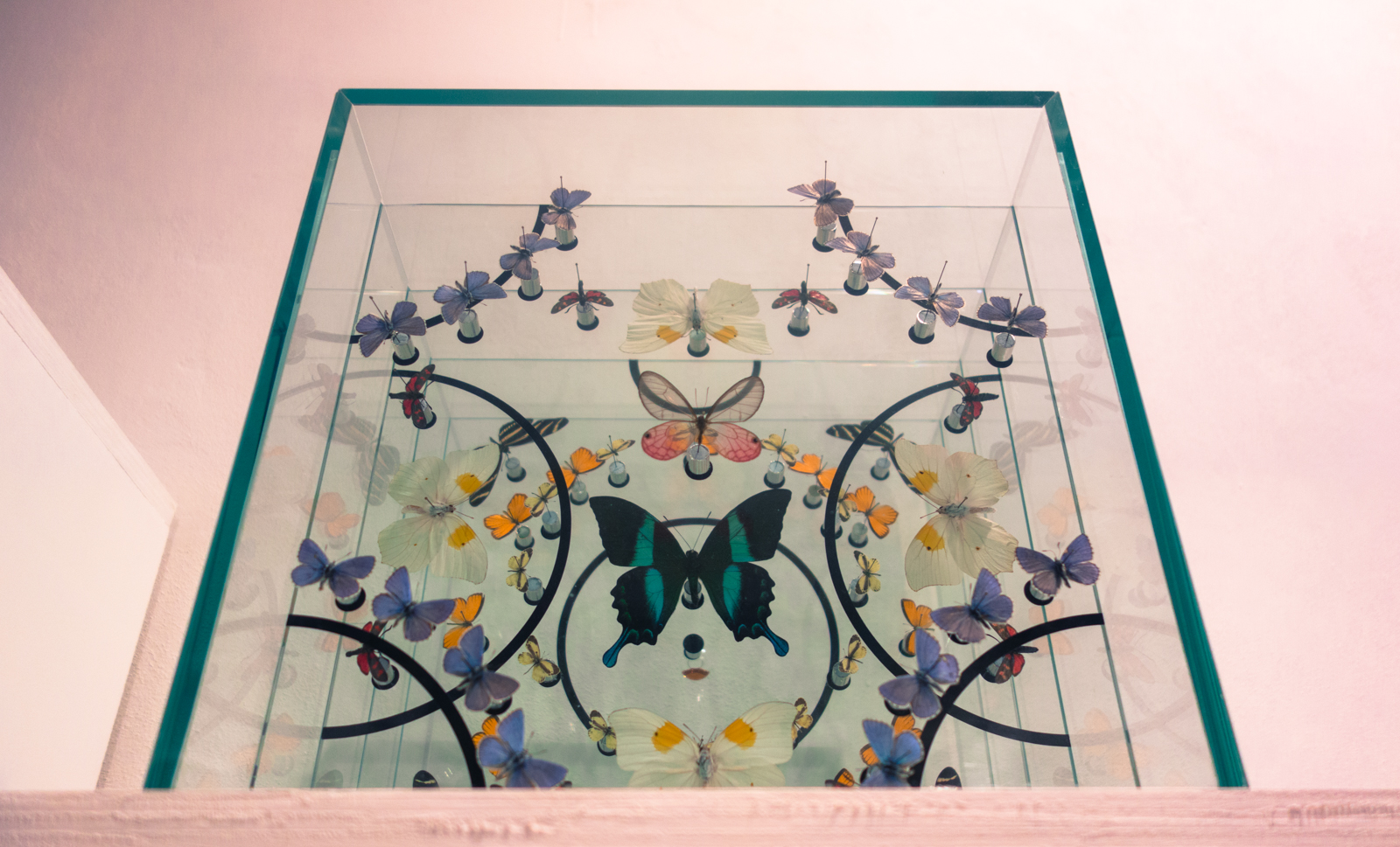 Si muove tra simbolismo e psichedelia la ricerca artistica di Dionea che presenta una serie di opere inedite all’interno dell’ Alchemy Room, spazio espositivo dedito alla ricerca. Le farfalle, soggetto delle opere ed emblema di bellezza e caducità, vengono catturate in diversi luoghi del mondo, e private, ante tempo, della loro vita fugace mettendo in atto un sacrificio: eternizzare la loro bellezza con la morte. Attraverso teche in vetro e fotografie su lastre trasparenti Dionea rappresenta sotto forma visiva il suo universo tramite la stratificazione, leitmotiv delle opere. Veri insetti vengono posizionati creando, attraverso la stratificazione dei fogli in vetro, effetti caleidoscopici che rimandano, insieme alle dimensioni delle teche, a una geometria quasi mai casuale, quella della natura, raffigurata anche nella geometria sacra. Le opere rappresentano un mondo, dentro una teca o uno scrigno, in cui un insetto è il punto tridimensionale che si distingue all’interno dello spazio.