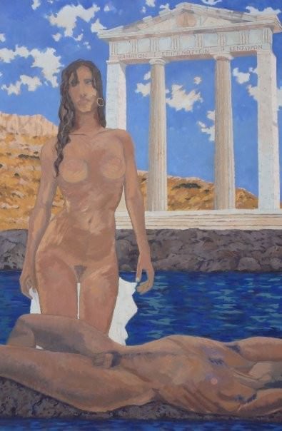 Scenari d’elezione di questa breve ma significativa selezione di lavori, rigorosamente risolti ad olio su tela, sono molti degli infiniti intermundia possibili, spiagge e isole lambite dalle acque e non-luoghi metaforici di leggende e racconti accaduti in contesti temporali sincronici incerti, espressione di valori assoluti e immortali come i templi dorici o ionici che in ogni tela costituiscono il punto di fuga dei nostri sguardi e lo scrigno delle nostre memorie cultuali e storiche.