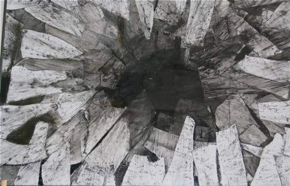 Il titolo ECHO richiama il nome della ninfa del mito antico e diviene oggetto di una riflessione sulla condizione culturale odierna. Il libro, luogo della parola scritta e della trasmissione del pensiero, è assunto quale elemento per una scultura di tradizione classica volta 'a togliere' e a scavare. Nuove stratigrafie tridimensionali si vengono a determinare come 'geografie della mente'. Già nei volumi degli ultimi anni, costituiti da disegni finemente lavorati con la grafite e sovrapposti gli uni agli altri, si costituivano particolari planimetrie, visioni aeree di spazi visionari e desolati dal forte impatto emotivo. Anche nei lavori recenti la componente figurativa è determinata dalle componenti del lavoro e senza volontà narrative ma piuttosto con la volontà affermativa di una condizione rigorosamente etica ed evocativa. In questo caso determinante è la presenza di un elementop caratteristico del suo lavoro, il drappo giallo, codice che indica uno stato di pericolo o di diversità. Ancora una volta il segno energetico e sapiente rifugge i tremori e le incertezze in una continua attenzione al particolare e all’apparente indefinito, spalancando visioni tra micro e macrocosmo. Negli anni la cenere e la grafite come il gesso e la carta, oggi dei libri, o la presenza di una sega circolare accesa sono elementi sintattici che definiscono il luogo ove ritrovare la memoria culturale di un presente consapevole di una sua profondità, anche storica, e una non è più rinviabile riflessione estetica sul fare arte.