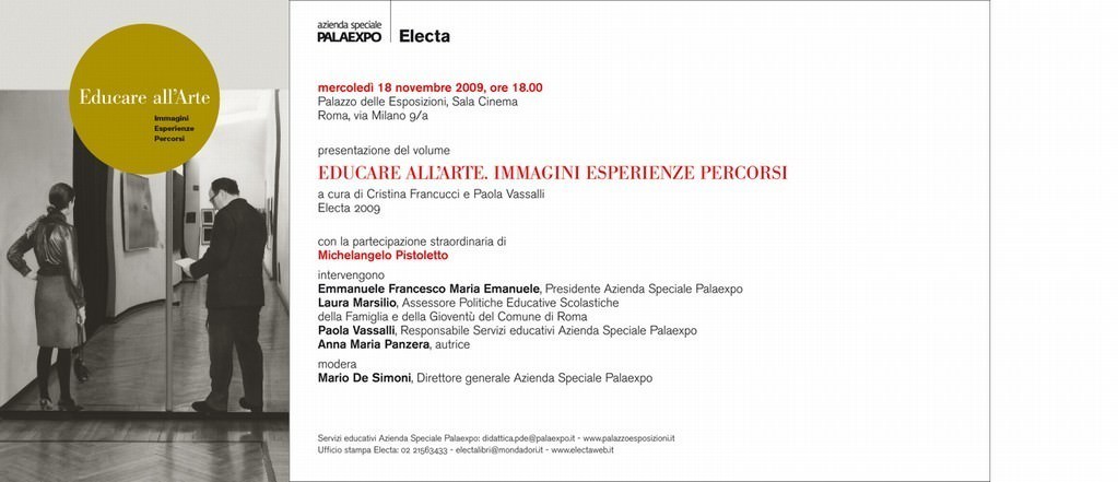 Il 18 novembre alle ore 18 verrà presentato nella Sala Cinema del Palazzo del Esposizioni il volume Educare all'arte. Immagini esperienze percorsi, edito da Electa e dall’Azienda Speciale Palaexpo, a cura di Cristina Francucci e Paola Vassalli. Con la partecipazione straordinaria di Michelangelo Pistoletto.