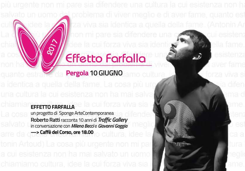 Sabato 10 giugno 2017 alle ore 18.00 protagonista di Effetto Farfalla è Roberto Ratti che racconterà al Caffè del Corso di Pergola (ingresso libero), in conversazione con Milena Becci e Giovanni Gaggia, i 10 anni di Traffic Gallery, la galleria che ha fondato a Bergamo nel 2007. Traffic Gallery è luogo di sostegno e promozione della conoscenza dell'arte del nostro tempo, specializzata in arte multimediale, digitale, fotografia, videoarte, urban e street-art. L’attività della galleria si articola nella programmazione di mostre nella propria sede, nell’organizzazione di mostre in collaborazione con istituzioni pubbliche e private ed enti museali e nella partecipazione ad eventi fieristici in Italia e all’estero. L'intento della galleria è stato fin dall'inizio quello di rappresentare l'innovazione artistica a 360° privilegiando il Come rispetto al Che Cosa. Per questo motivo la programmazione degli artisti appare molto eterogenea, con ricerche formalmente molto diverse tra loro. La programmazione delle esposizioni in galleria si articola attraverso conferme e nuove proposte, conferme rappresentate dagli artisti con i quali la galleria ha instaurato un solido rapporto di collaborazione nel tempo quali l’artista tedesca Karin Andersen, il duo di street artists Orticanoodles, l’artista pugliese Cosimo Terlizzi, la street artist spagnola Andrea Michaelsson aka Btoy, lo street artist polacco Mariusz Waras aka M-City e nuove proposte che vanno ad indagare le molteplici curiosità presenti nel panorama artistico contemporaneo come ad esempio il duo artistico Corpicrudi presentati nel 2012, e l’artista Romano Andreco.