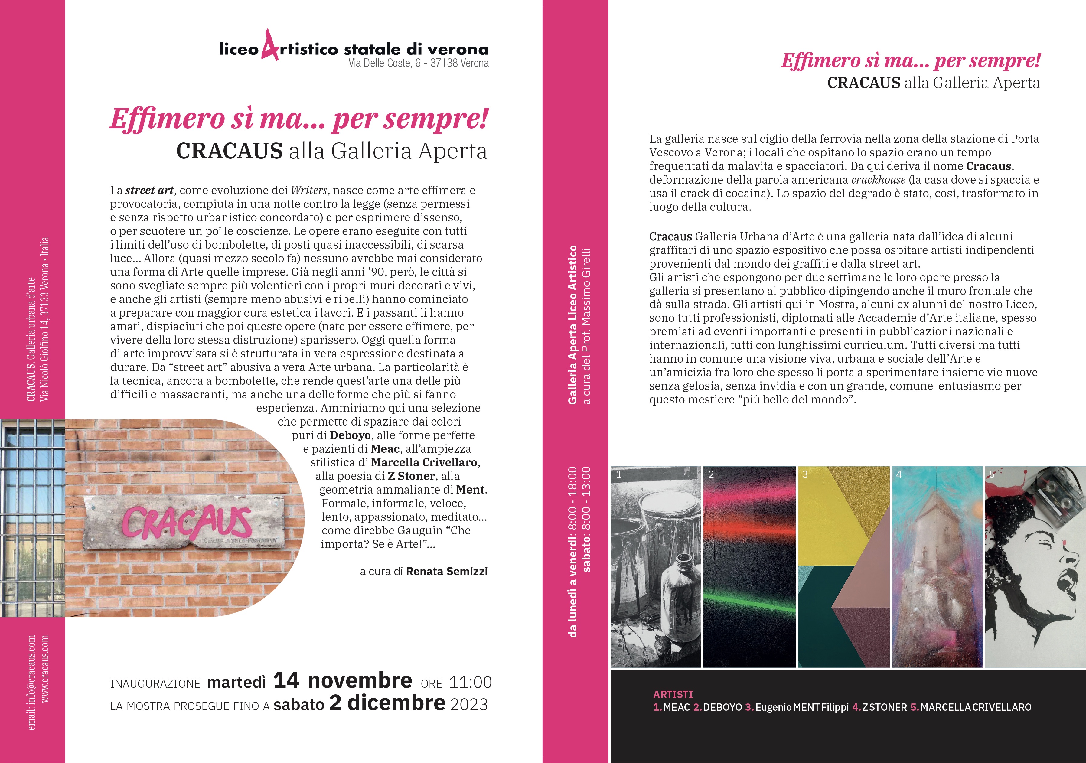 Cracaus Galleria Urbana d’Arte è una galleria nata dall’idea di alcuni graffitari di uno spazio espositivo che possa ospitare artisti indipendenti provenienti dal mondo dei graffiti e dalla street art. Gli artisti che espongono per due settimane le loro opere presso la Galleria Aperta sono ex alunni