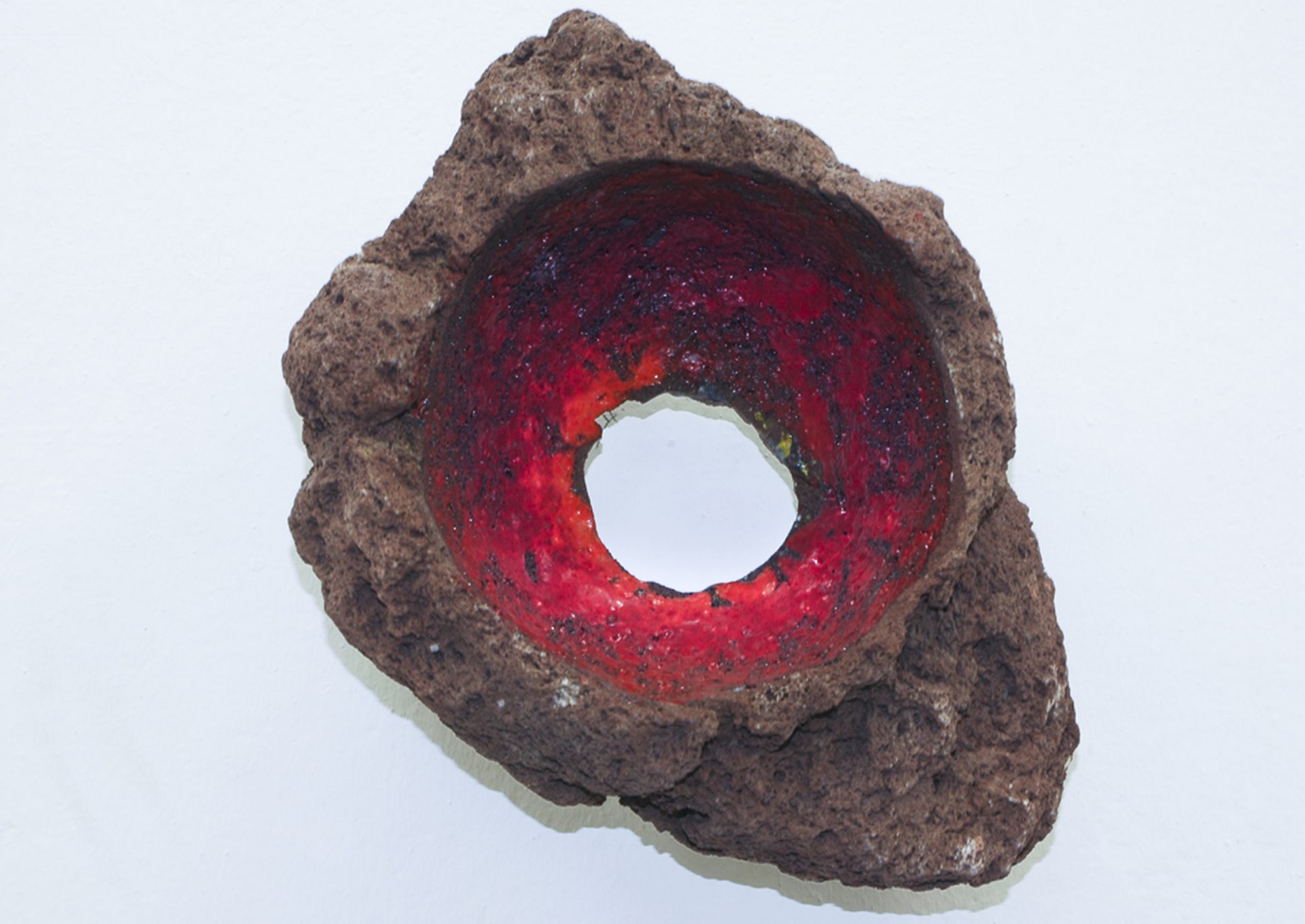 La geografia del vivere rappresenta l’unione simbolica di materie inorganiche: la pietra, la ceramica, lo smalto rosso servono a Shayegh per raccontare una personale cosmogonia che riunisce nei due nuclei scultorei l’origine primordiale, l’immagine di un buco nero, il big bang.