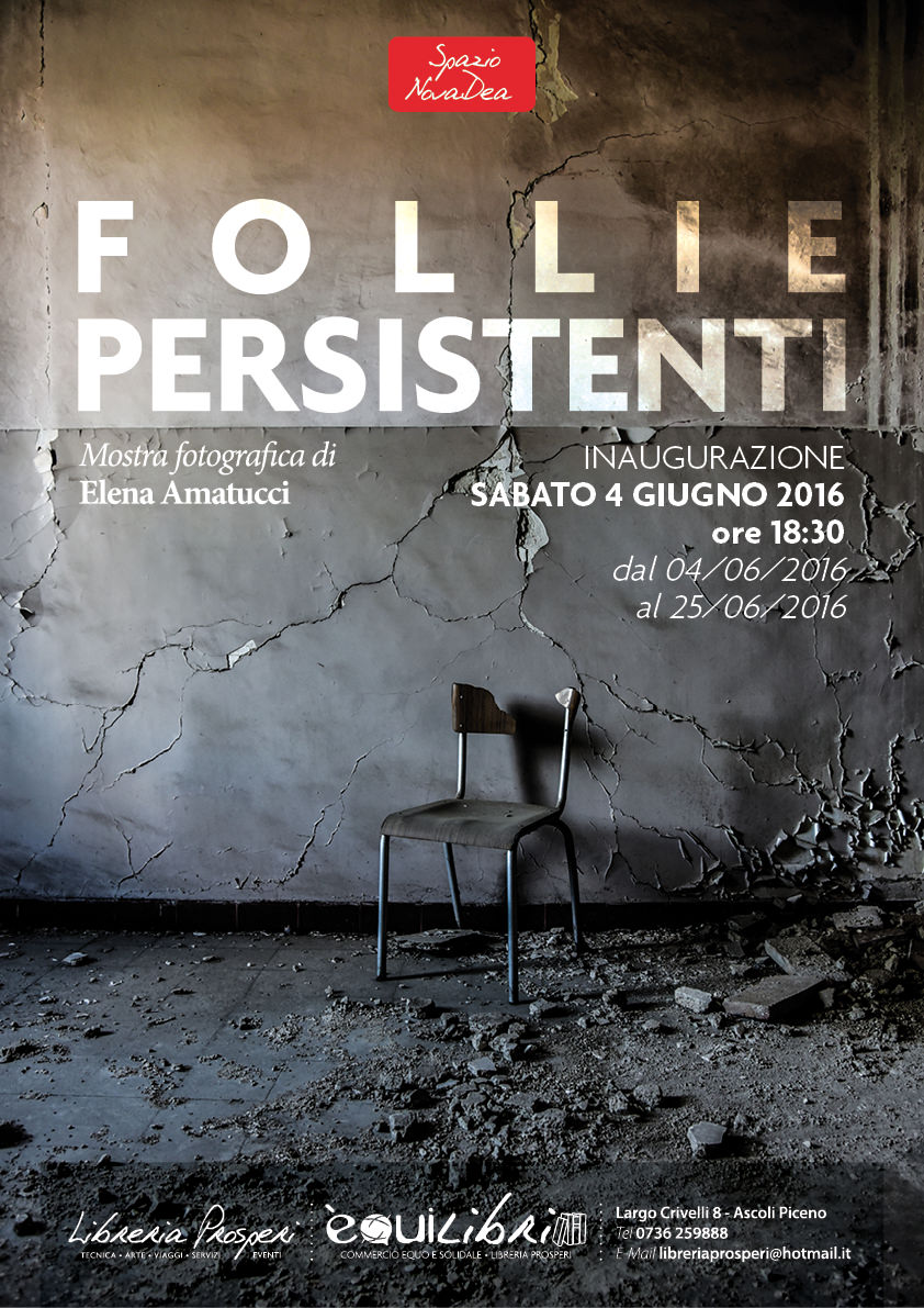 Un’ultima esposizione fotografica conclude - prima della pausa estiva - la stagione espositiva dello Spazio NovaDea di Ascoli Piceno, la galleria all’interno di èquilibri (commercio equosolidale + Libreria Prosperi) in centro storico. Sabato 4 giugno vi aspettiamo per l’inaugurazione della mostra intitolata FOLLIE PERSISTENTI, un reportage fotografico realizzato da Elena Amatucci nell’ex ospedale psichiatrico di Teramo, abbandonato dal 1998.