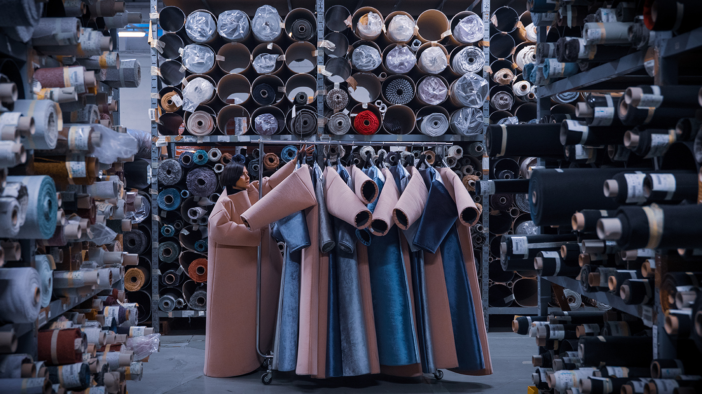 La stanza principale della Fondazione Dino Zoli è occupata dall’installazione di quattordici abiti-scultura, pensati e realizzati con i tessuti di Dino Zoli Textile. Declinati nel lino rosa per alludere al corpo e nel velluto grigio-azzurro per richiamare le tute da lavoro, gli abiti presentano una forma a trapezio che accoglie sia il corpo maschile sia il corpo femminile, dando alla figura un aspetto onirico.