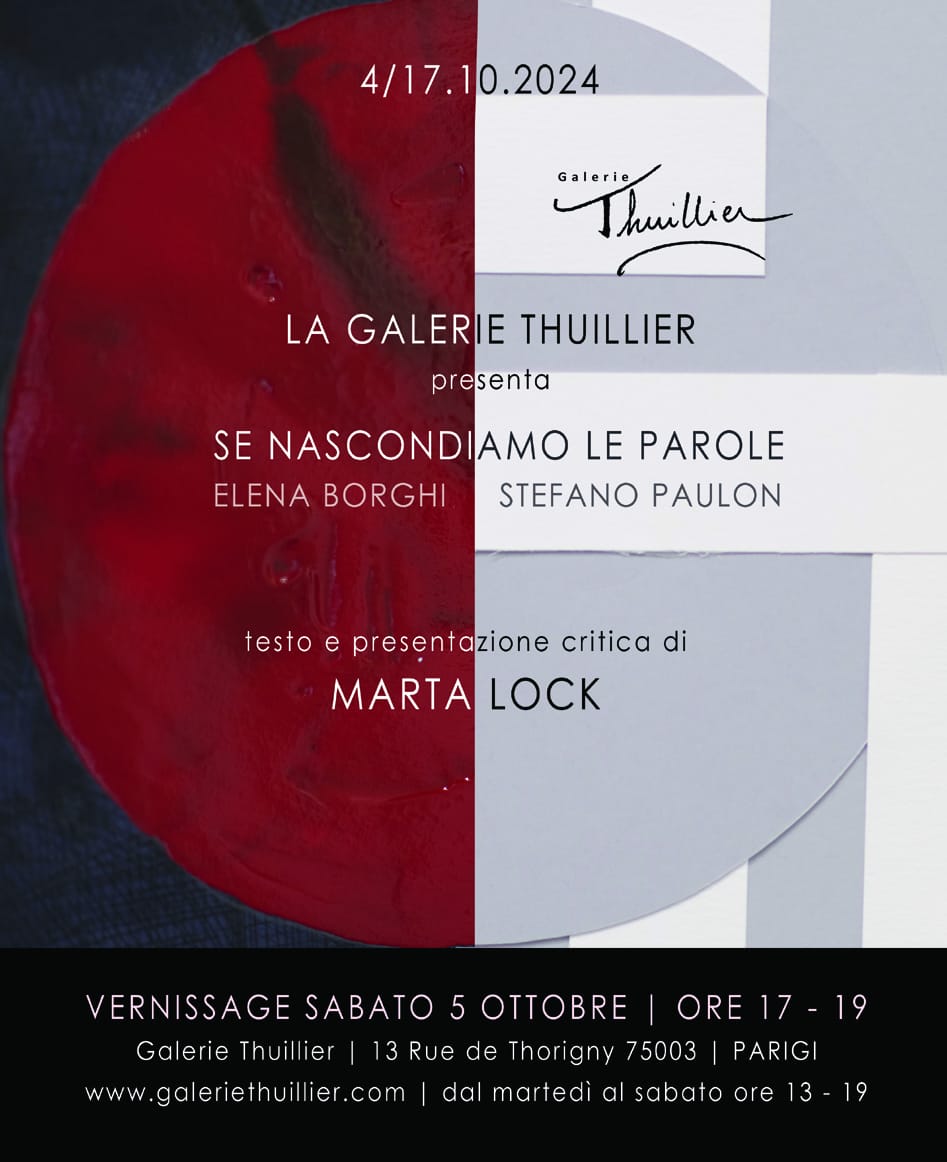 La mostra bi-personale già presentata con successo a Milano, sarà esposta per la prima volta a Parigi, nel bellissimo e prestigioso quartiere del Marais, presso la Galerie Thuillier. L’introduzione alla mostra sarà curata dalla critica d’arte internazionale Marta Lock.