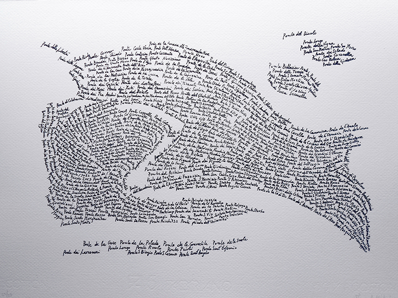 Elena Dell’Andrea dal 2009 lavora sul tema degli AttraversaMenti con opere pittoriche e video su Mosè -MOSE legati alla città di Venezia. L’Opera nel corso del tempo si trasforma, da un lavoro di denuncia, ad una ricerca più spirituale, dopo l’incontro con il Maestro Remo Salvadori. Assume declinazioni grafiche nella mappa costituita da tutti i nomi dei ponti di Venezia, Venezia e i suoi Ponti, pubblicata in L’Acqua è Maestra. Questo progetto si arricchisce con tutti gli spunti derivati da altre Città con ponti, come Amsterdam.