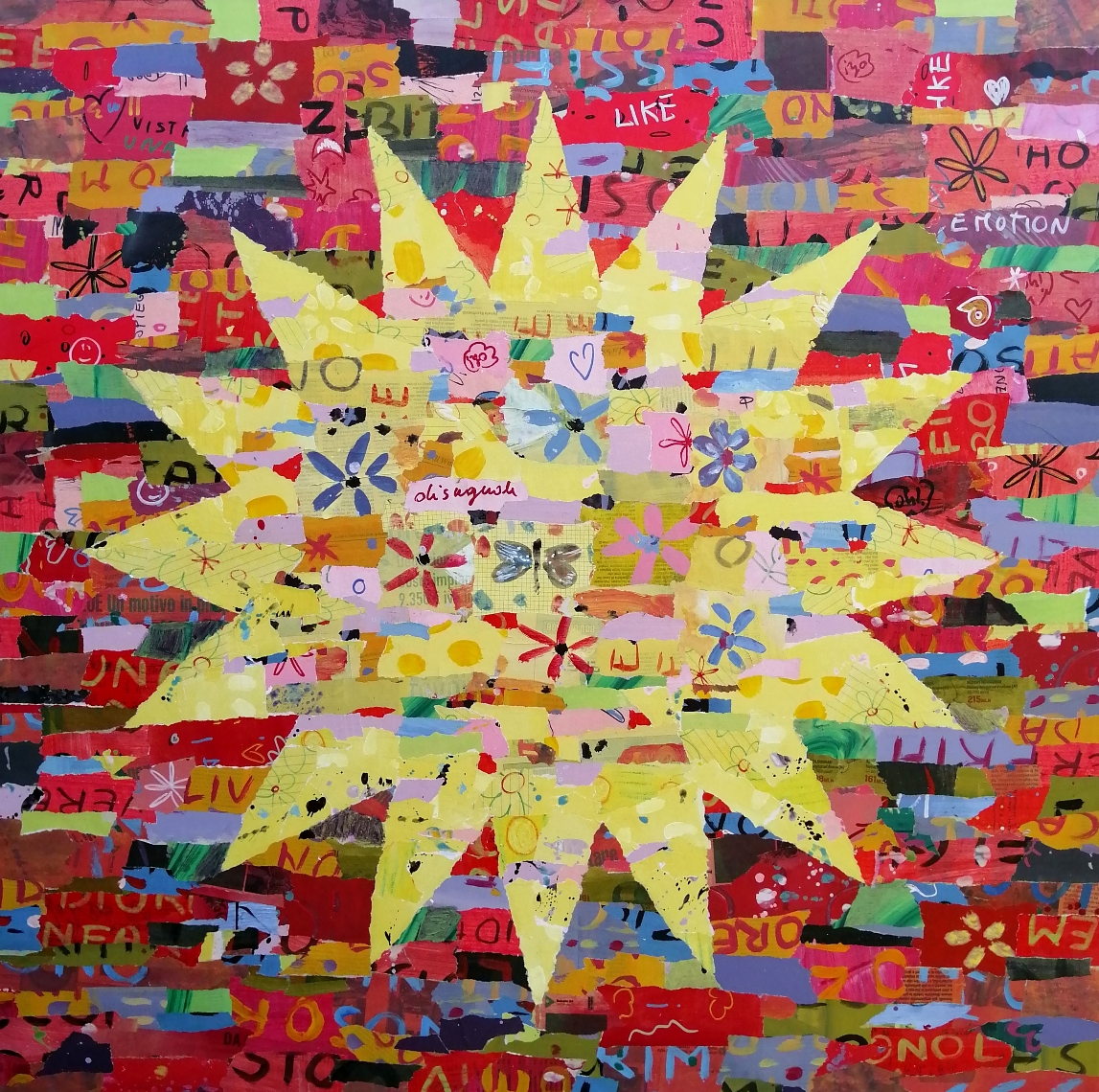 Le sue ultime opere in esposizione, in questa mostra pisana che ho il piacere di ospitare, hanno un chiaro riferimento quindi ai temi più attuali come il Covid (malattia che l'autrice ha vissuto direttamente e che ha coinvolto l'intera umanità), gli emoji, i social, la resilienza, il desiderio di liberta, la musica."