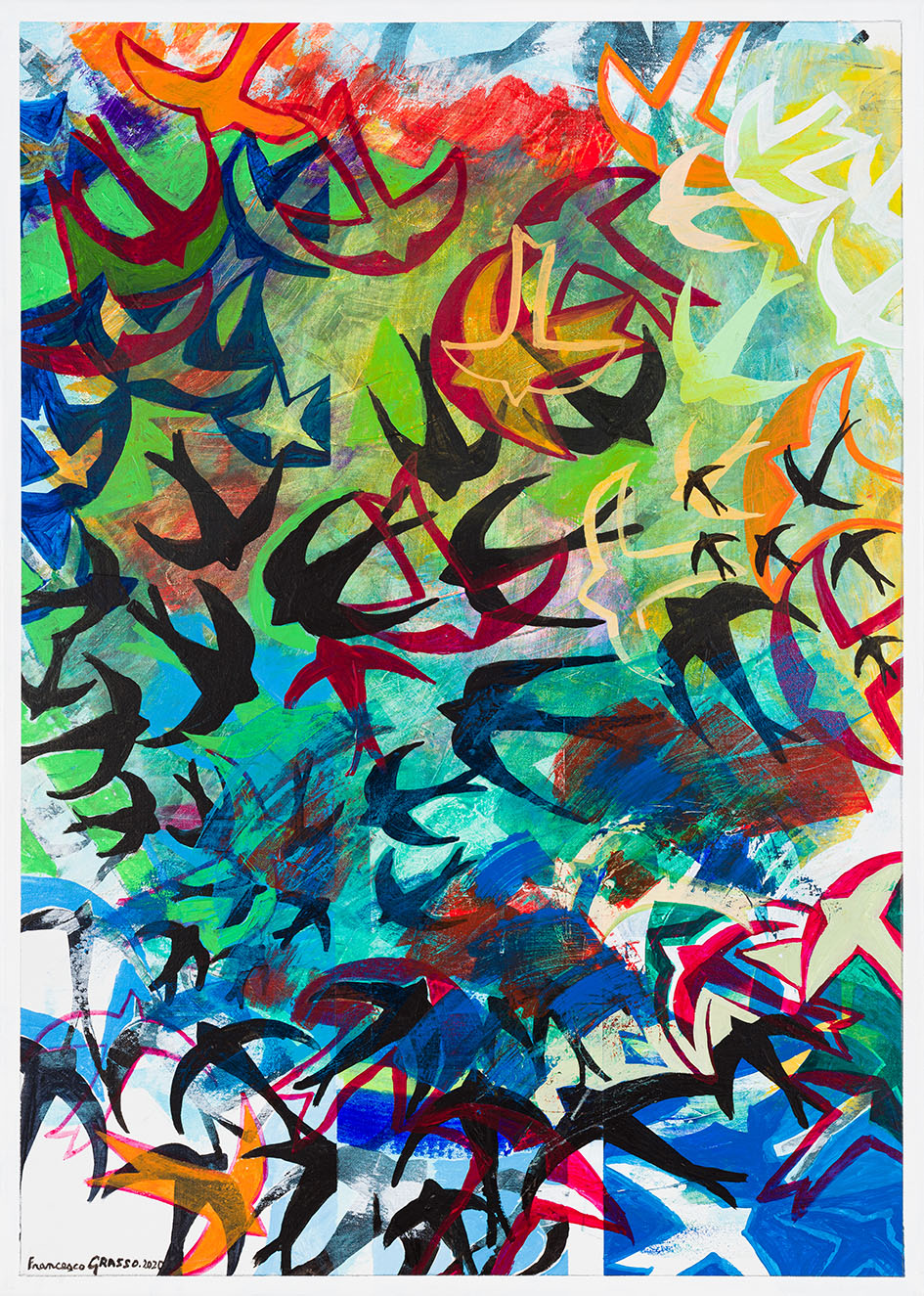 La grazia è insita nella produzione pittorica di Francesco Grasso, mentre la stessa produzione di opere, è invece senza calcolo; è spontanea come i suoi movimenti, i suoi pensieri, come la rosa del poeta Angelus Silesius: “La rosa è senza perché, fiorisce perché fiorisce; non pensa a sé, non si chiede se la si veda oppure no”. Anche Francesco Grasso non si aspetta che si guardi “fiorire le sue creazioni”, né aspetta lo sguardo altrui che, quale ringraziamento, sarebbe la sua ricompensa. Egli produce per produrre, senz’altra ragione che la freschezza di una bellezza che lo pervade e gli basta sentire questo per continuare a produrre arte. La grazia delle sue opere unisce, così, la giovinezza del suo fare pittorico che fin dall’origine non ha bisogno di altro che di se stessa e la dolce incoscienza che l’accompagna nell’immaginare uno spazio pittorico incontrollato, prima dello studio e della conseguente irruzione della legge di uno stormo di storni in volo nelle sue opere. Proprio grazie allo studio sulla complessità degli stormi di uccelli, l’opera pittorica di Francesco Grasso, sotto l’incanto dei primi tempi, annunciava che era approdato “al tempo della grazia”; la sua pittura si vestiva così come uno di quei fiori campestri spontanei in tutta la sua gloria. (…)”