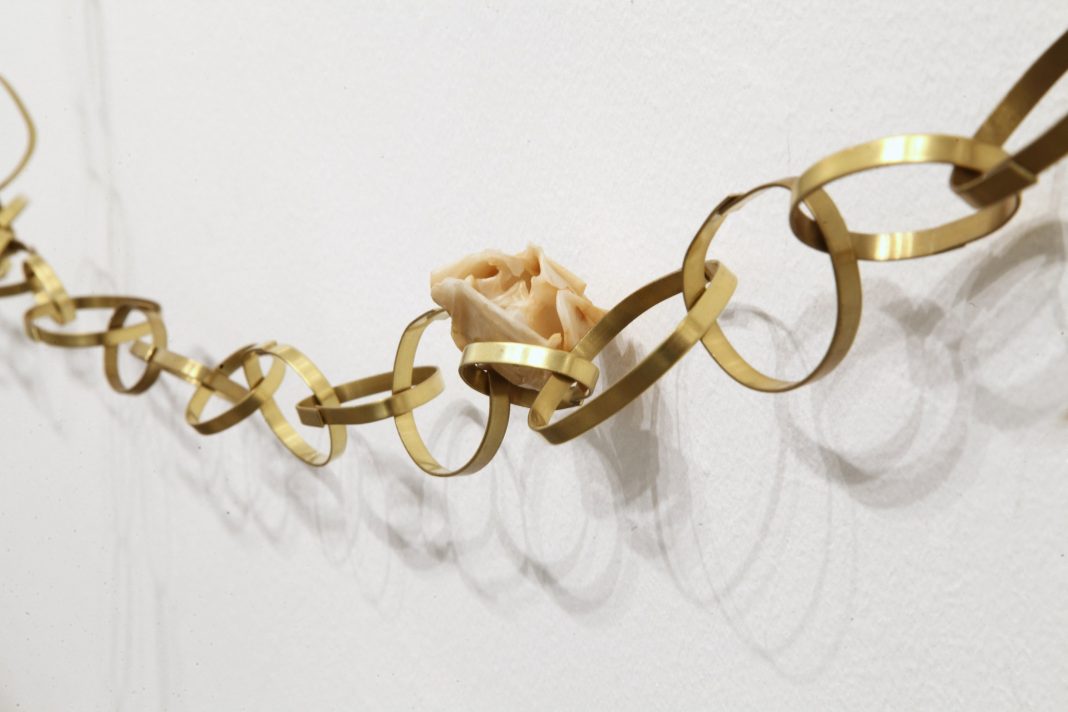 Realizzati con vari materiali – garze, lamierino d’ottone, graffiature su carta, superfici specchianti e, comunque, la consueta cera – i nuovi lavori nascono dal concetto di “paia”, cioè di coppia, che significa in primo luogo “relazione”: tutto è giocato sul fatto che il paio è anche il doppio, il duo, il nucleo elementare della ripetizione e del ritmo, ma anche del rapporto fra l’uno e l’altro, l’interno e l’esterno, o di quello fra traccia e supporto. E’ il caso dei fogli con le “lacrime” graffite , lavoro posto in tensione dalle frasi a tema pronunciate dalle voci in loop dei filosofi Laura Odello e Georges Didi-Huberman. Sempre in dialogo, due lunghe garze cerate cadono verso il suolo, riflettendosi su di una superficie specchiante, come una cascata che sgorga da due punti (due occhi?); più ambiguo è il nesso fra i caleidoscopi contrapposti, dove lo sguardo si ferma sul fondo mentre sembra che i due “cannocchiali” si guardino. Ma l’opera al centro dell’esposizione è nascosta dietro un pudico paravento semitrasparente: è un letto per due persone, appena accennato nel suo perimetro: il luogo del riposo e dell’amore, dunque dell’intimità, di cui non resta che il contorno, la delimitazione di un valore, ma in bilico, sfrangiato e a perdere. L’affioramento della memoria e del tempo, così dichiarato nei suoi lavori precedenti, qui in certi casi è più mediato, in altri più esplicito, sicuramente meno intellettuale e più emotivo, più immediatamente legato al vissuto, che non è solo il vissuto, il diario dell’artista, ma la vita di tutti.