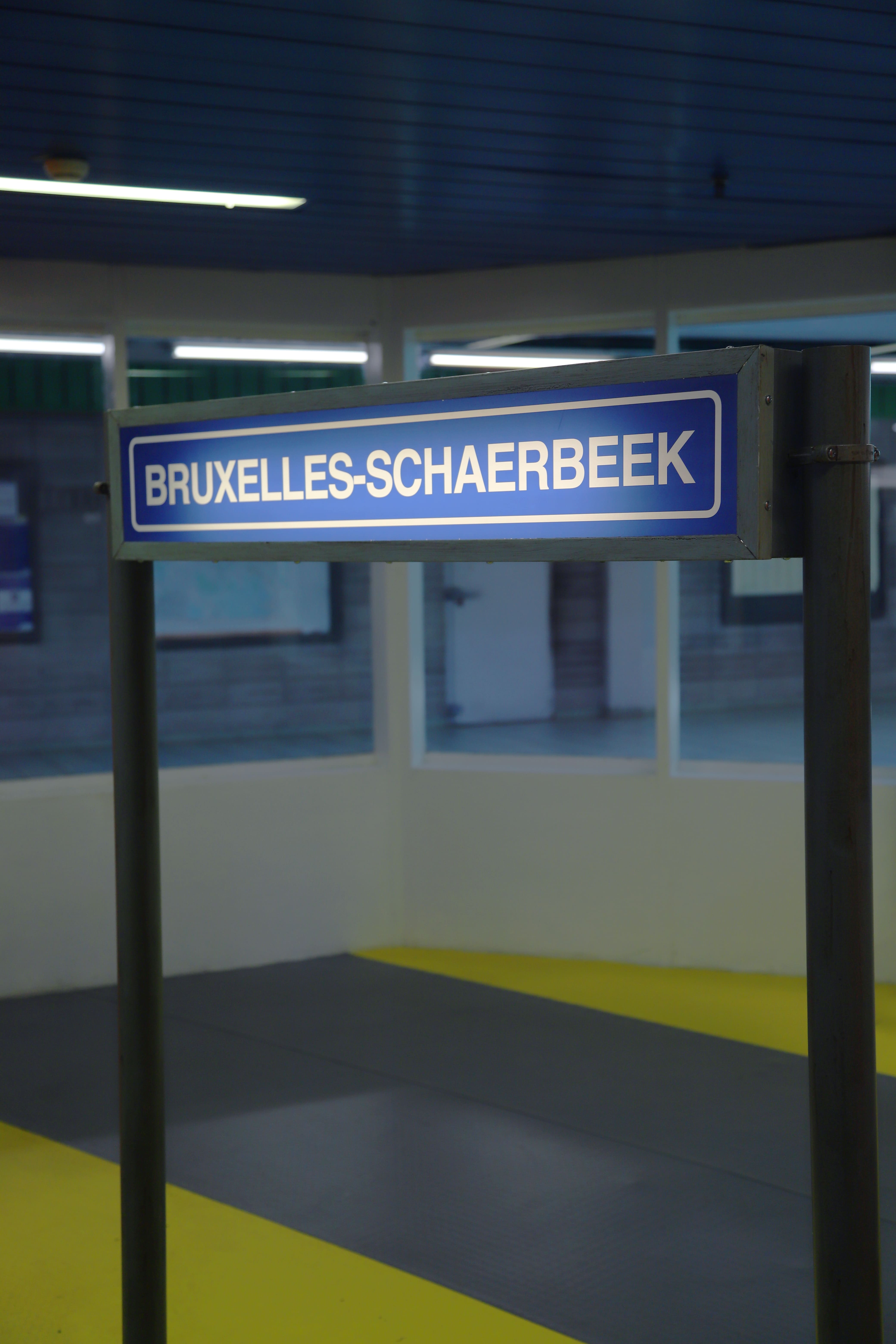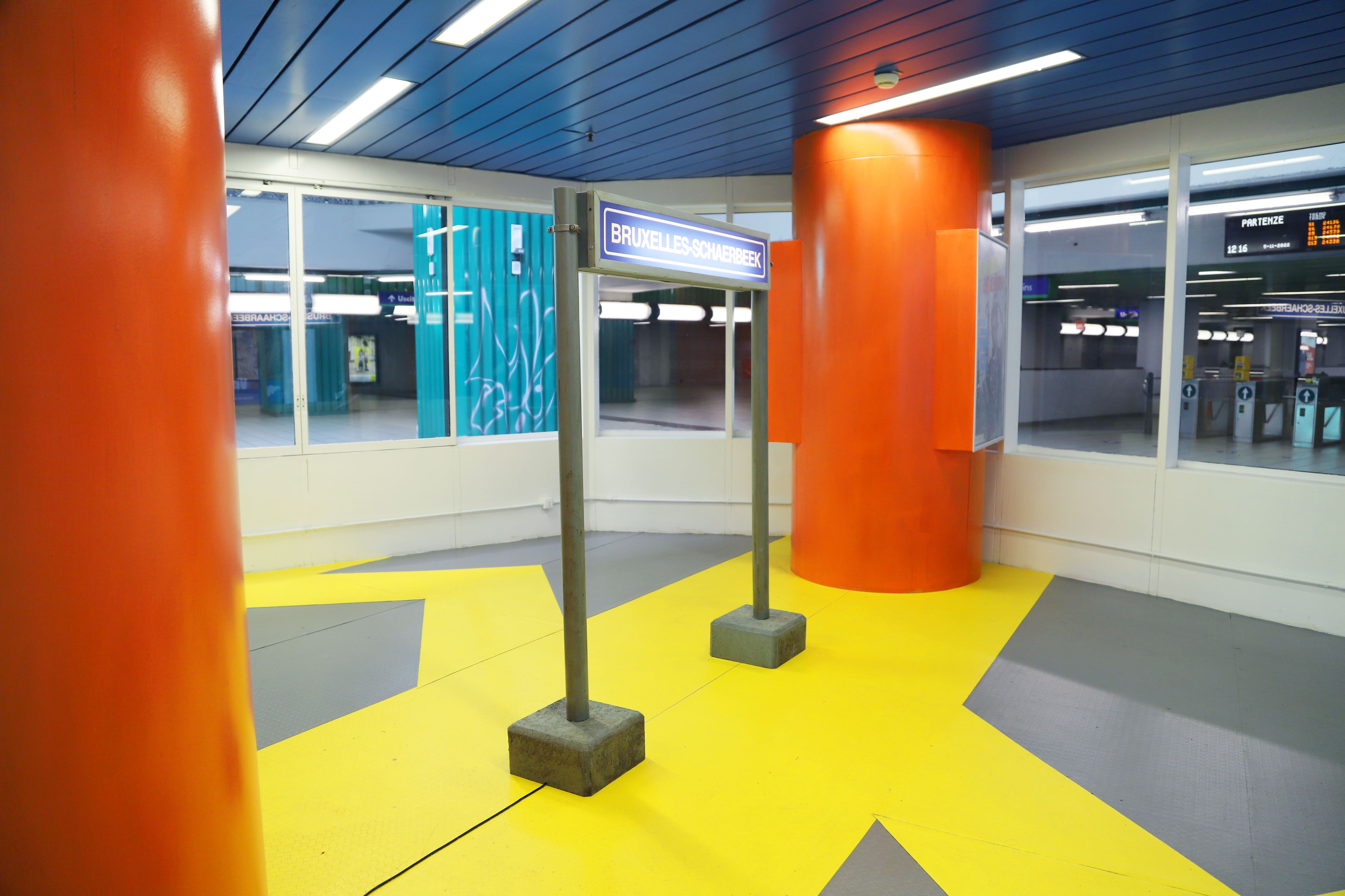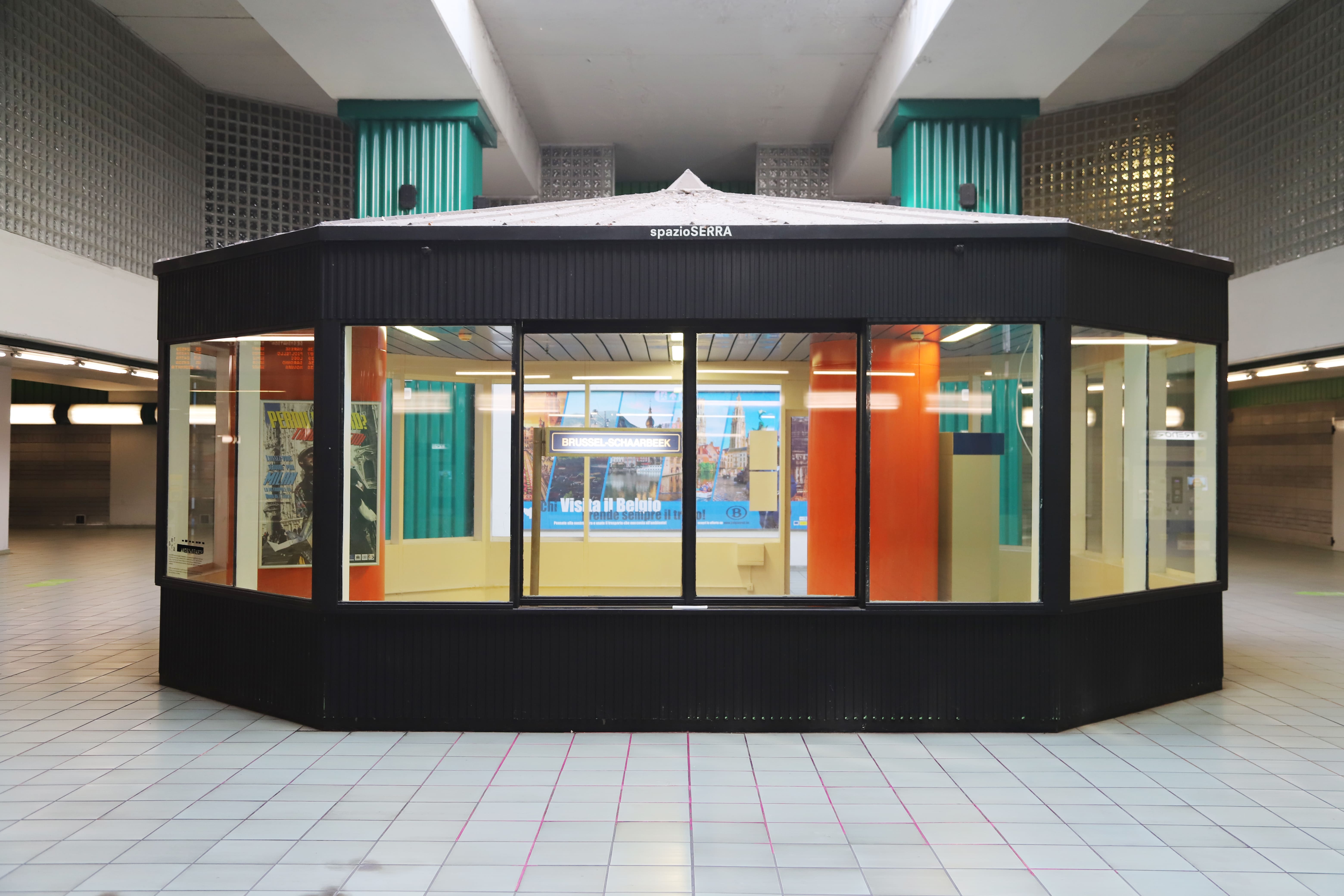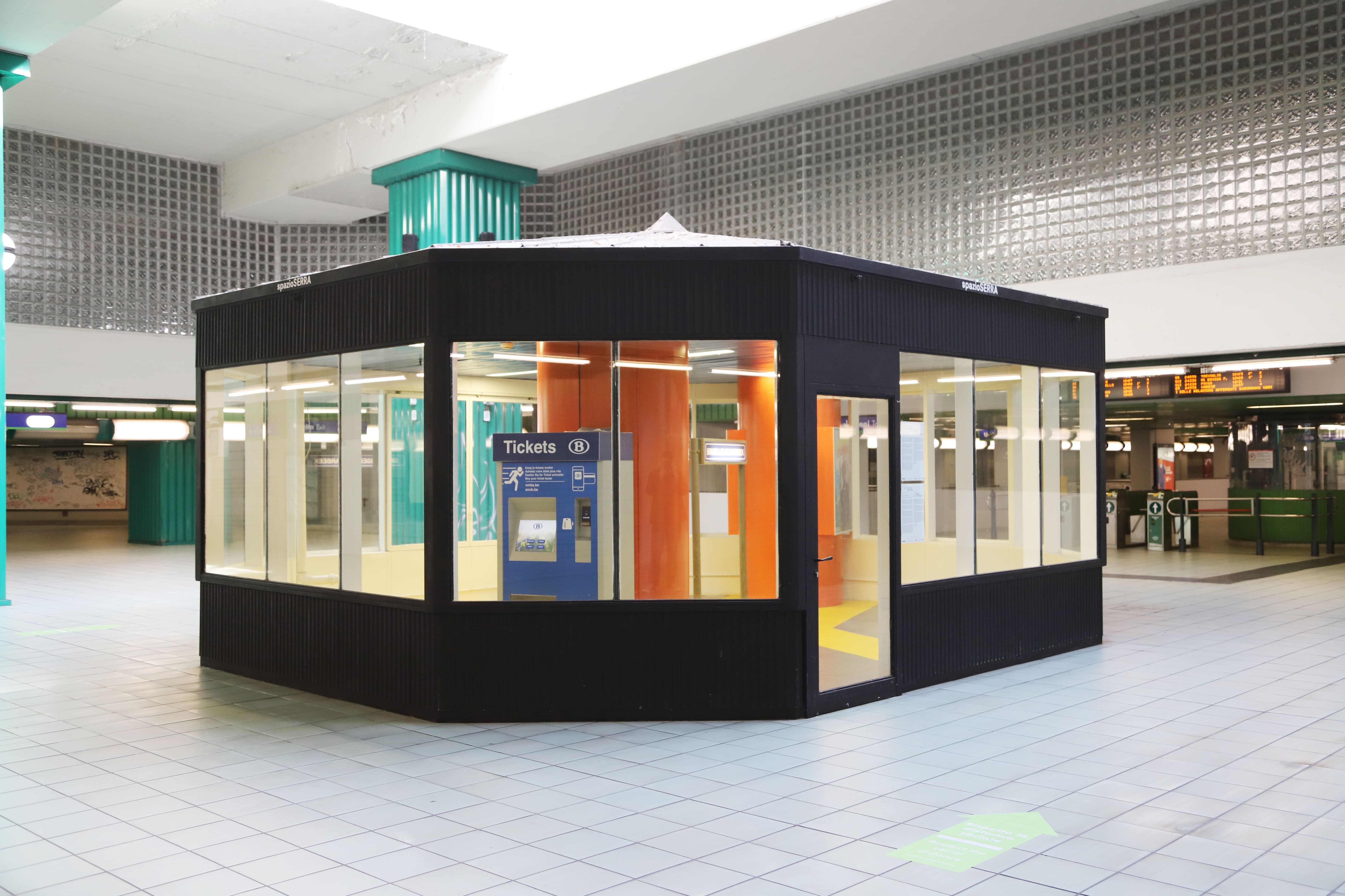 L’installazione Connecting Stations of Past and Present si compone di pilastri portanti, una macchinetta che vende i biglietti, cartelli segnaletici, un pavimento in PVC: all’interno dell’ex edicola trova spazio la stazione belga di Schaerbeek (in olandese Schaarbeek).