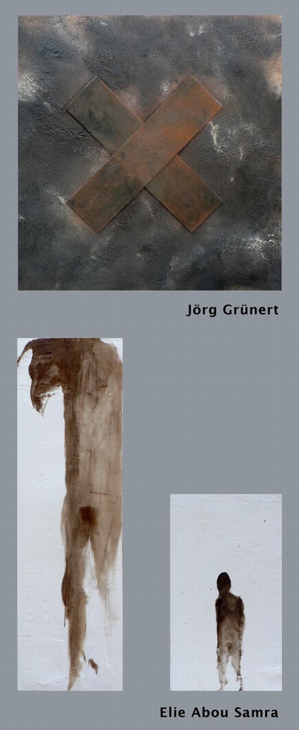 “Le ultime opere di Jorg Grunert ed Elie Abou Samra, pur presentandosi con rese formali molto lontane tra loro – scultore/installatore il primo, pittore l’altro - possono iniziarci a riflettere su un paradigma operativo che le accomuna. Esse ci permettono di portare la nostra attenzione su di una particolare modalità dell’agire artistico che ha conformato, e quindi stabilito sin dagli esordi, la stessa identità dell’arte moderna e contemporanea. ( … ) Un agire riferito a colui che è costretto a guardare la verità secondo uno stile soggettivo e non più oggettivo, e che soggiogato da un sostrato pulsionale inconscio fa emergere l’immagine, a lui pur sempre necessaria, da un ripetitivo atto di irresponsabilità corporea: l’automatismo. Fonte germinale, epifanica, dell’immagine necessaria alla costituzione del mondo. (…) Questo fondamento comune non decostruisce le due differenti storie personali che andiamo ad osservare, relegandole nei ristretti ambiti geoculturali - l’indomito raziocino purificatore/semplificatore del pensiero continentale in Jörg Grünert da un lato, la rincorsa metafisico/religiosa alla determinazione simbolica in Elie Abou Samra dall’altro - anzi, con maggiore attenzione, possiamo dire che li costringe ad una verifica, continua e reciproca, di una comunicazione condivisa sul piano del “soccorso”. Difatti, entrambi si aiutano sulla soglia di una deriva resa impersonale e cruda dalla forza distruttiva della storia umana contemporanea. Storia che con la sua fattualità ineluttabilmente oggettiva si è determinata nel limes di un medioriente, il Libano, ormai privo della sua tradizionale funzione di cerrniera culturale tra oriente ed occidente. Elie Abou Samra si appoggia alla natura intrinseca del mito, Jörg Grünert a quella della tragedia”.