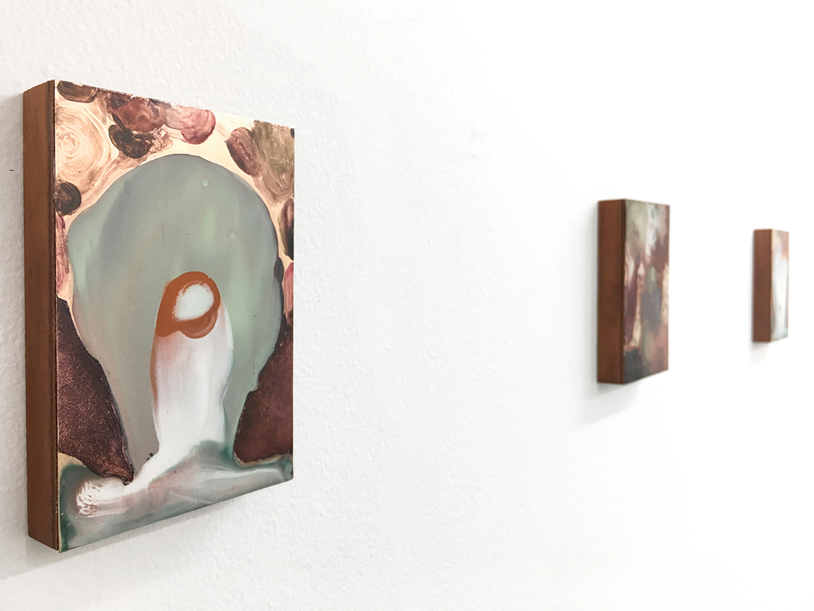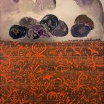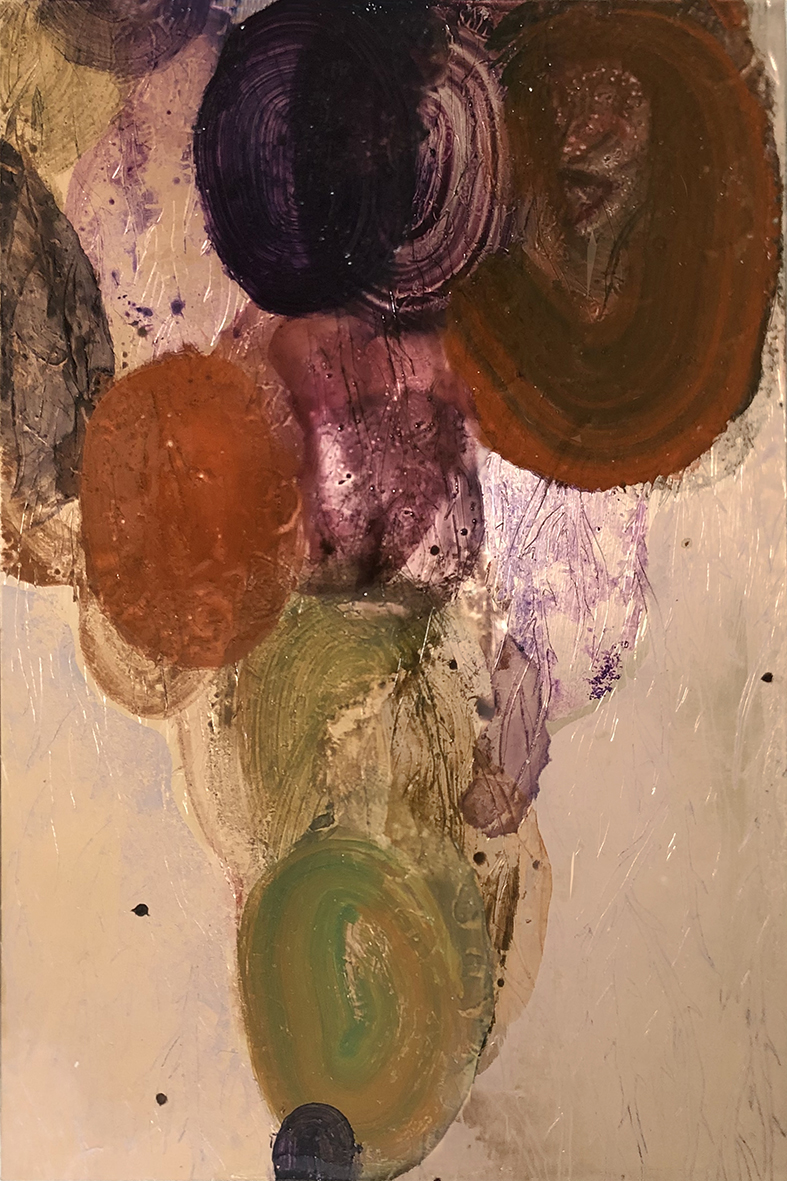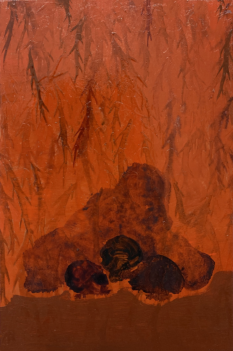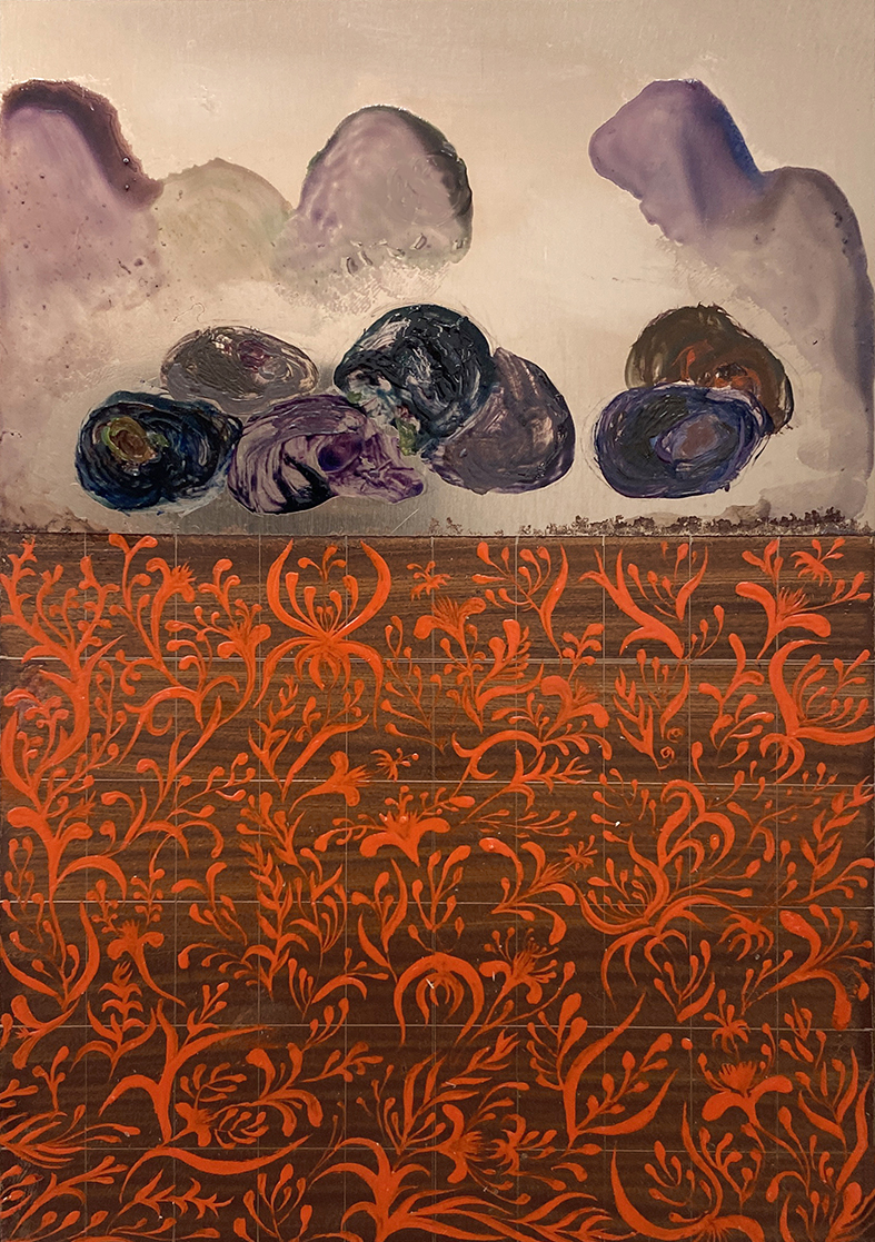 L'esplorazione dei concetti di coesistenza vita-morte e rinascita sono una costante della ricerca artistica di Bertaglia, che porta avanti un simbolismo personale e raffinato, fattosi sempre più astratto negli ultimi due anni. Questa nuova serie inedita, ispirata alle rappresentazioni tibetane delle narrazioni indigene sulla reincarnazione e i regni celesti, è caratterizzata da variazioni di tonalità di aranci aspri e placidi blu verdastri, da elementi grafici ossessivi, come l'intenso fogliame, e da allusioni al simbolo del teschio. Campiture di colore più denso, velature di tonalità diafane e minuziose incisioni della superficie metallica, dialogano insieme sulle superfici lucide dorate. Le aree specchianti e riflettenti amplificano la loro dimensione e invitano lo spettatore ad avvicinarsi e ad iniziare un dialogo intimo con le opere e con se stesso.