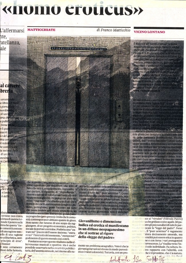 Elisa Ci Penagini, sovrapponendo immagini a immagini, presenta una nuova serie di fotografie in bianco e nero stampate sull’inserto culturale di un quotidiano. L’amalgamarsi dei diversi strati confonde e rimodella le immagini con i testi; è il supporto che rende irriproducibili e unici gli scatti